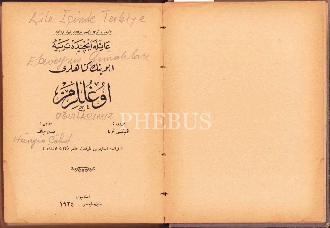 Osmanlıca Aile İçinde Terbiye Ebeveynin Günahları - Oğullarımız, Felix Thomas, Çev. Hüseyin Cahid, Tanin Matbaası, İstanbul 1924, 304 s., 14x19 cm, ÖZEGE; 311