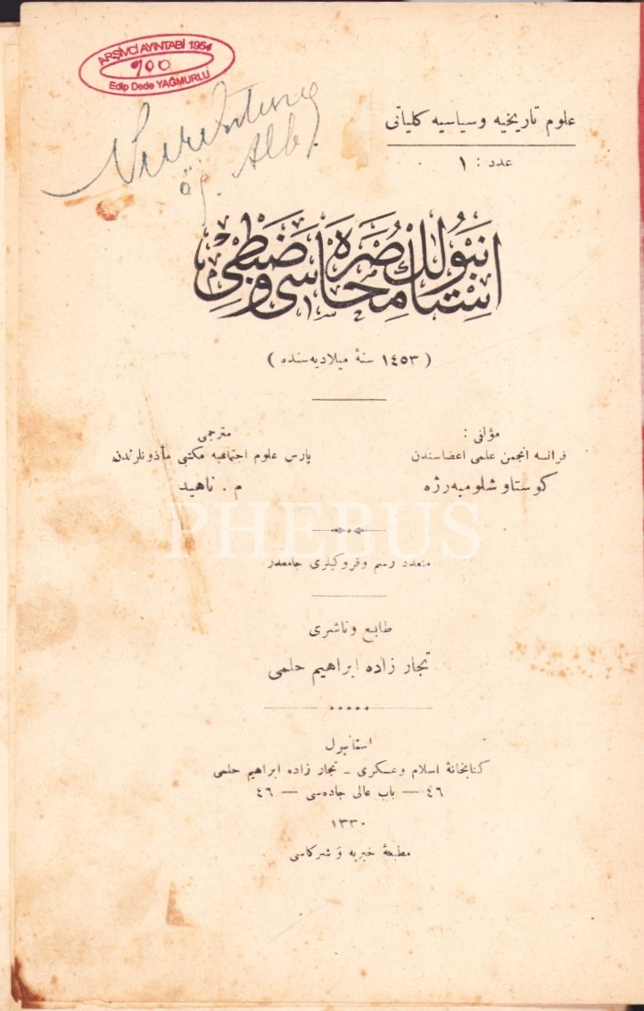 Osmanlıca İstanbul'un Muhâsarası ve Zabtı (1453 Sene-i Miladiyesinde), Gustave Schlumberger, Çev. M. Nahid, Kitabhane-i İslam ve Askerî, İstanbul 1330, 352 s., 17x24 cm, ÖZEGE; 8328