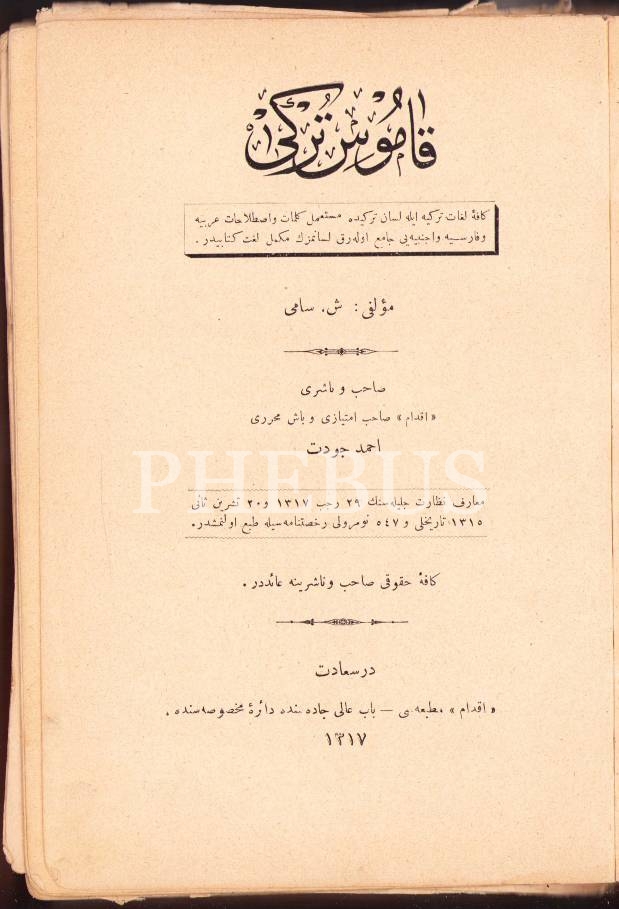 Osmanlıca Kâmûs-ı Türkî, Ş. Sami, İkdam Matbaası, Dersaadet [İstanbul] 1317, 1574 s., 17x24 cm, ÖZEGE; 9997
