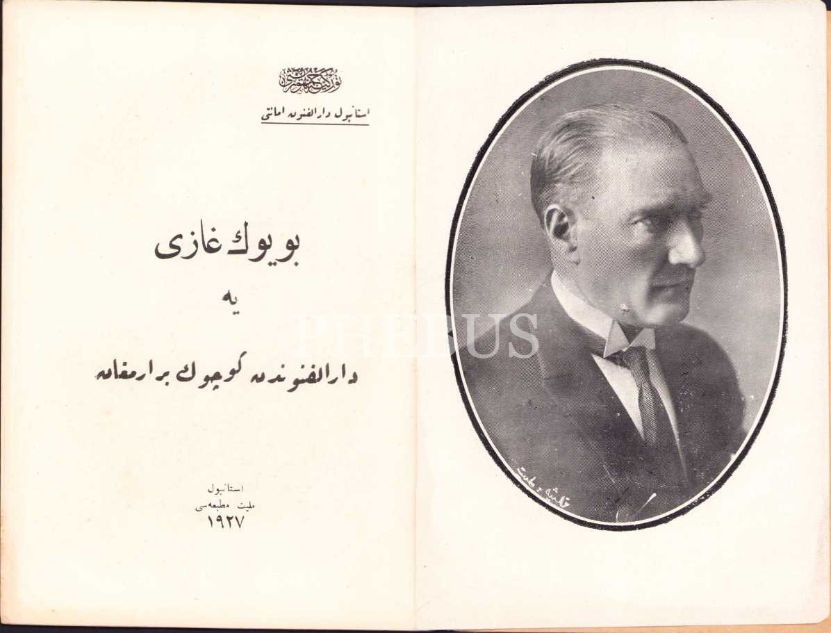 Osmanlıca Büyük Gazi'ye Dâru'l-Fünûn'dan Küçük Bir Armağan, Milliyyet Matbaası, İstanbul 1927, 32 s., 14x19 cm, Özegeno: 2734