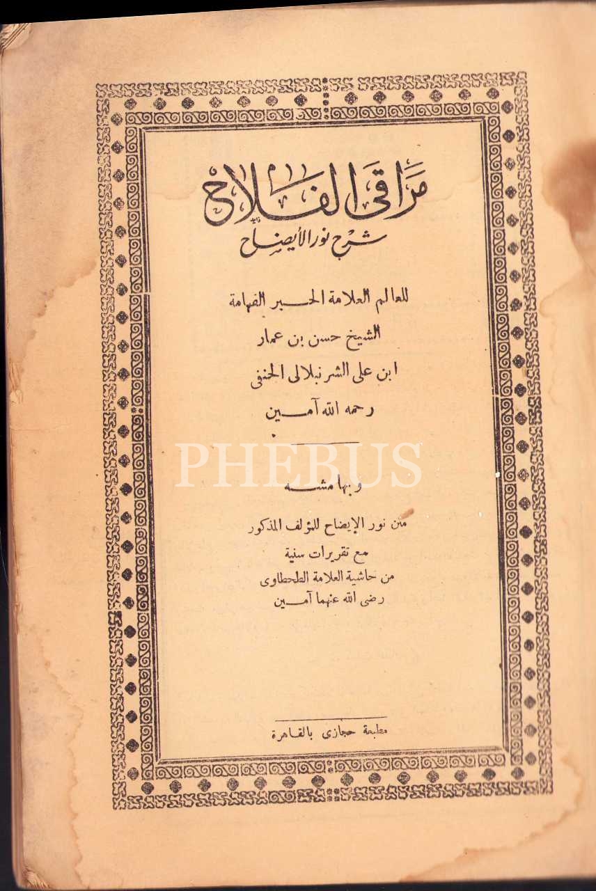 Arapça Merâkı'l-Felâh Şerhu Nûri'l-Îzâh, Şeyh Hasan b. Ammar Şürünbülâlî, Kahire/Mısır, 1372, 20x28 cm, kapak haliyle