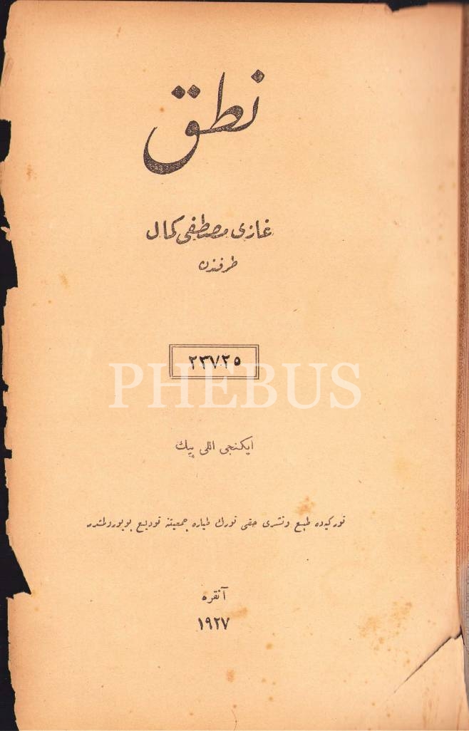 Osmanlıca Nutuk [İkinci elli bin baskıdan], Türk Tayyare Cemiyyeti, Ankara 1927, 543 s., 18x27 cm, iç sırt haliyle