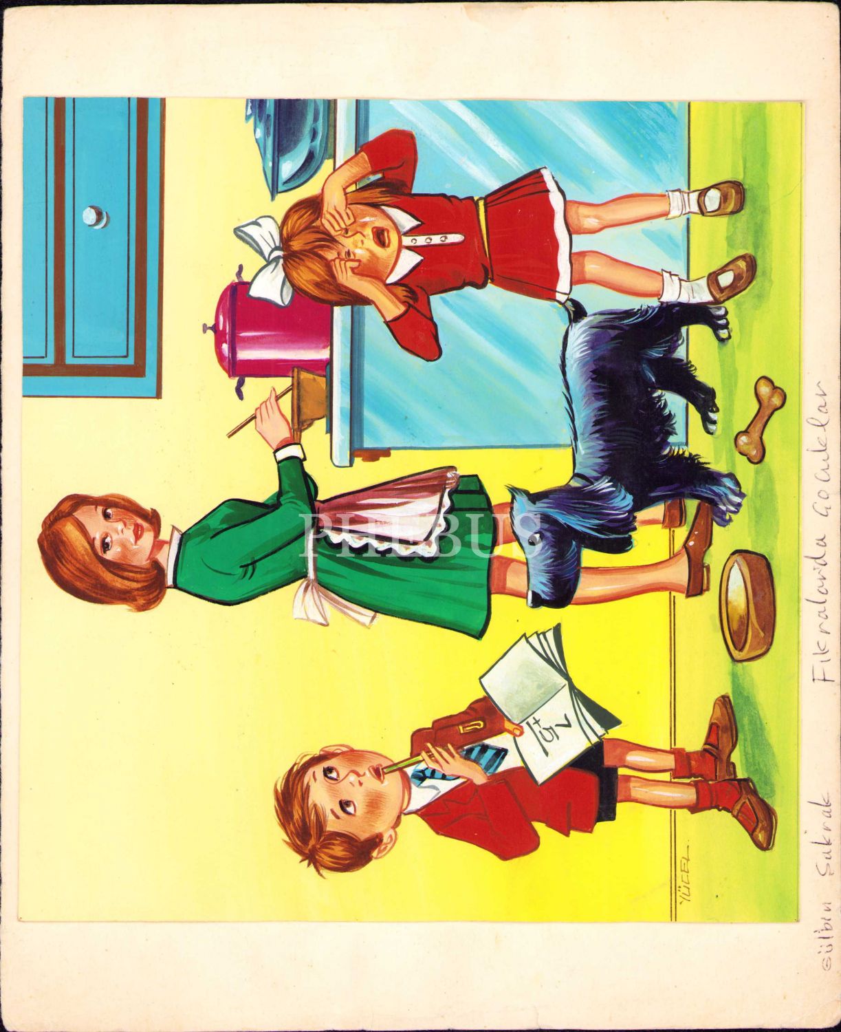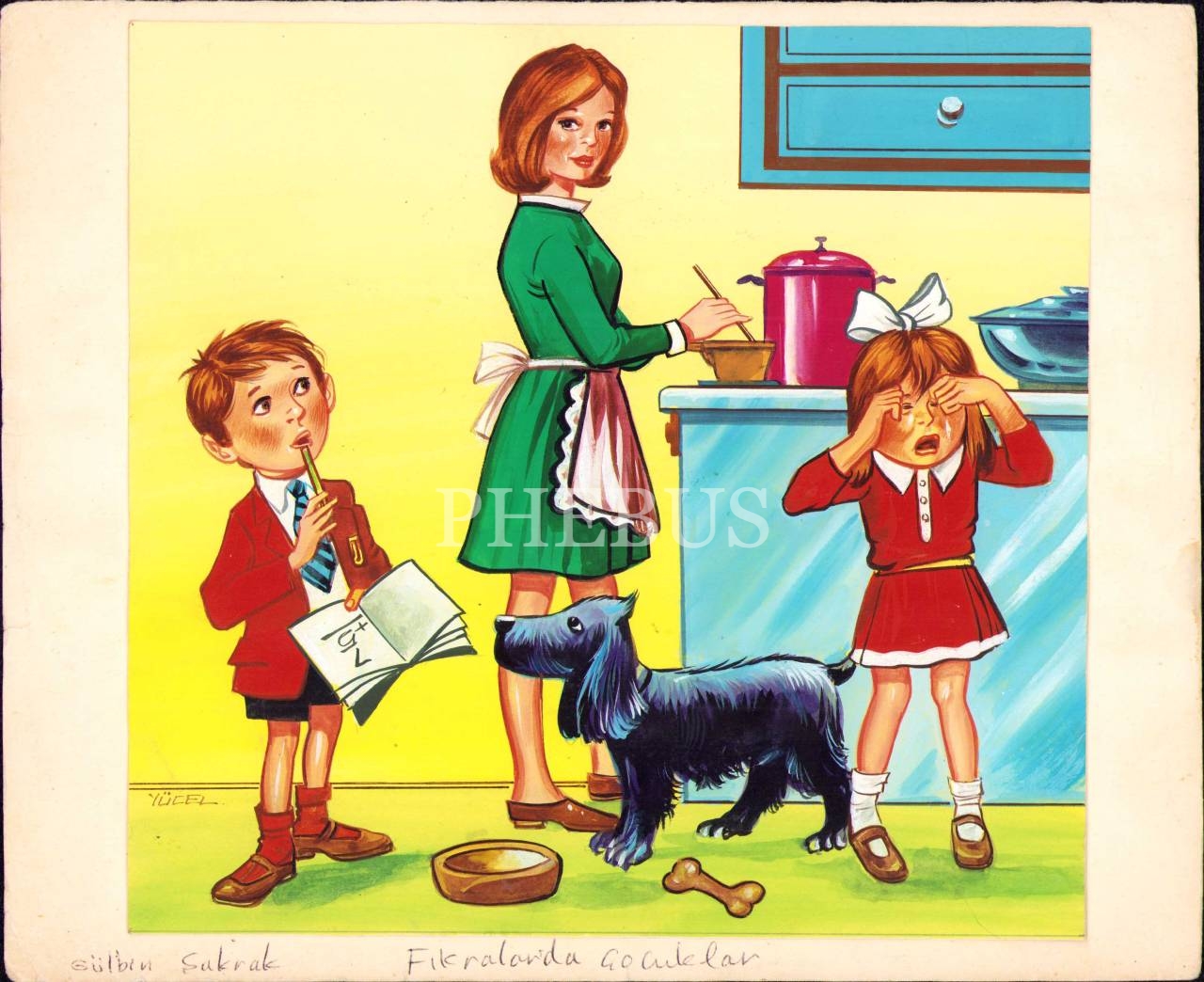 Yücel imzalı, karışık teknik ''Fıkralarla Çocuklar'' özgün çizimi, 20x19 cm