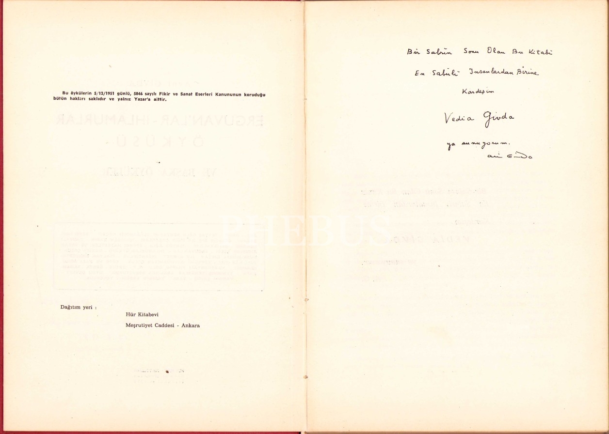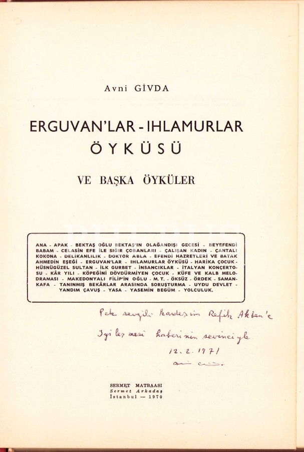 İthaf, "Pek sevgili kardeşim Refik Akben'e iyileşmesi haberinin sevinciyle, 12. 2. 1971, Avni Givda" şeklindedir.