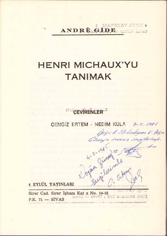 Tercüme Eden Cengiz Ertem ve Nedim Kula'dan İmzalı ve İthaflı "Henri Michaux'yu Tanımak", Andre Gide, 4 Eylül Yayınları, 45 sayfa, 13x18 cm