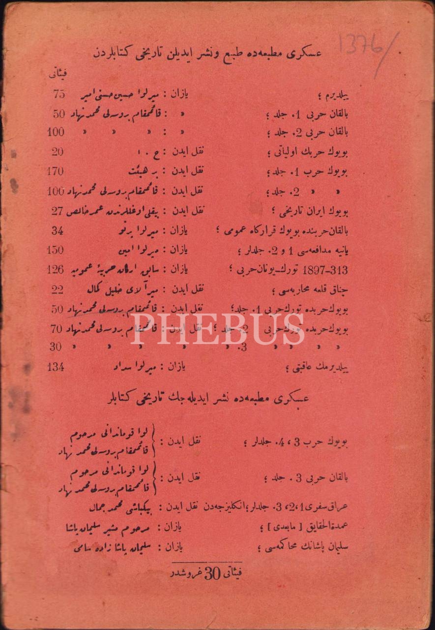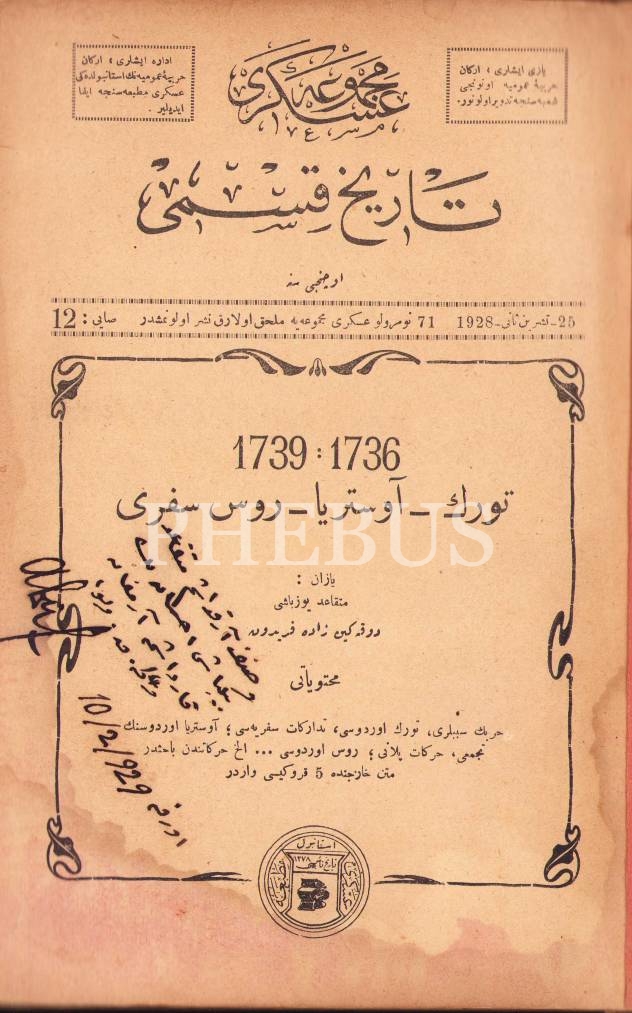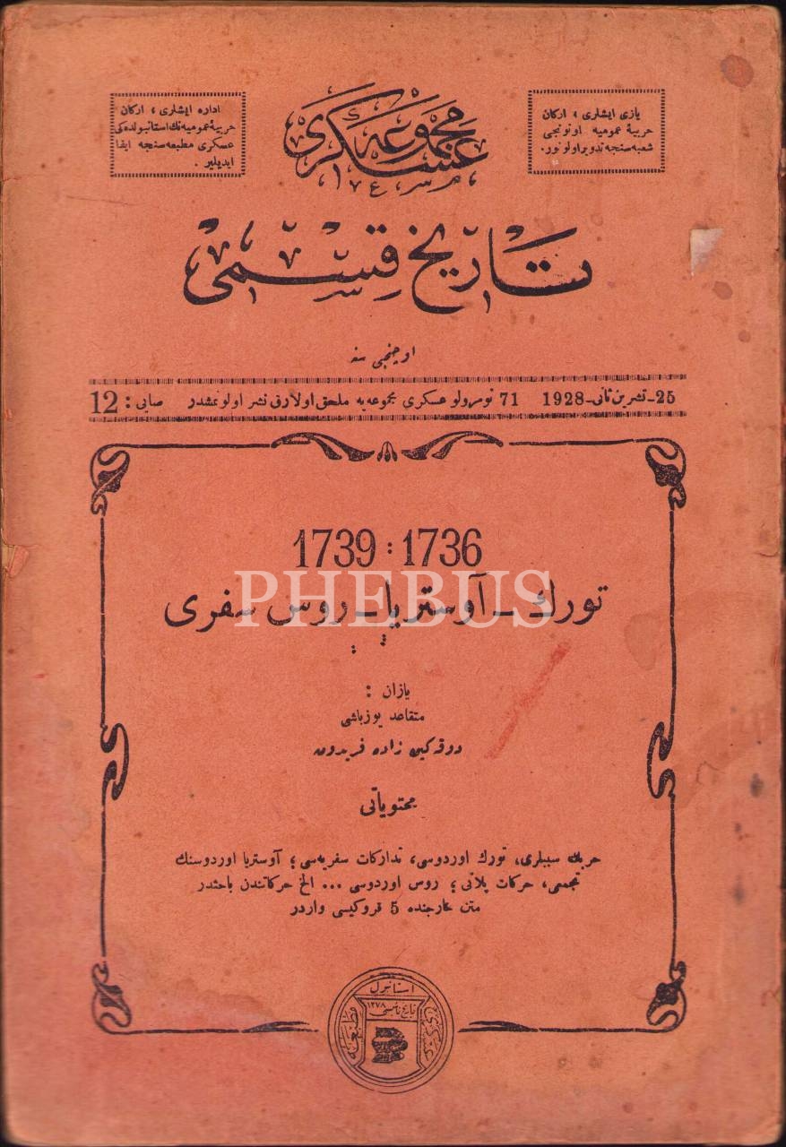 Osmanlıca Askeri Mecmua'nın Tarih Kısmı, Mütekaid Yüzbaşı Dukakinzade Feridun, Osmanlıca imza ve ithaflı, Askeri Matbaa, 1928, 41 sayfa, 16x24 cm, yıpranmış haliyle