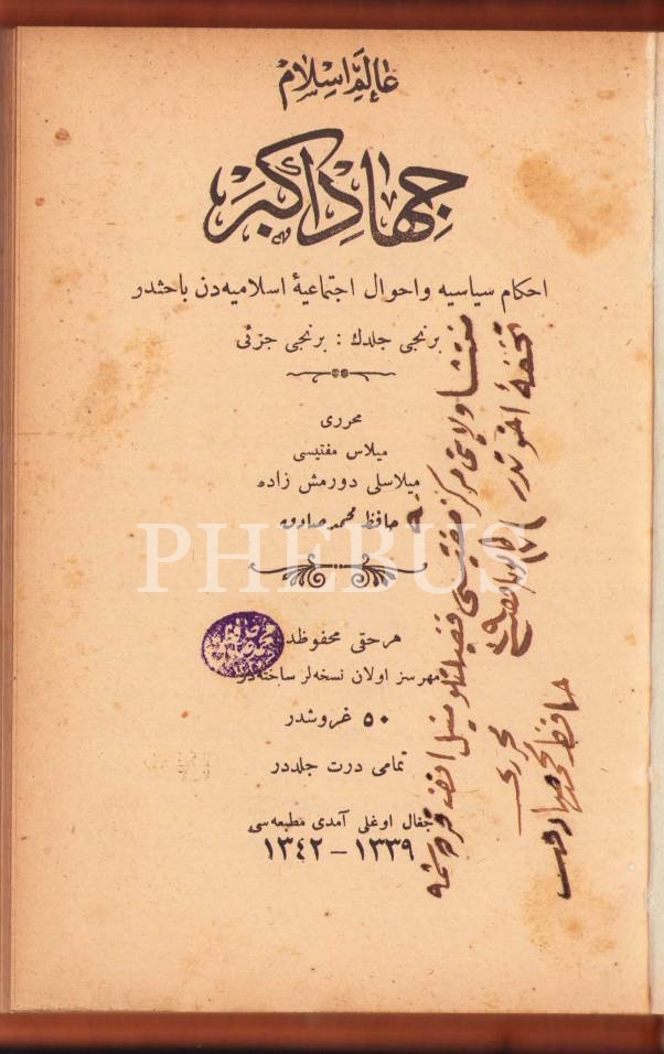 Osmanlıca Cihad-ı Ekber,Yazarı Milas Müftüsü Milaslı Durmuşzade Hafız Mehmed Sadık'dan Menteşe Merkez Müftüsü'ne İmzalı ve İthaflı, Birinci Cild, Amidi Matbaası, 1342, 196 sayfa,14x20 cm
