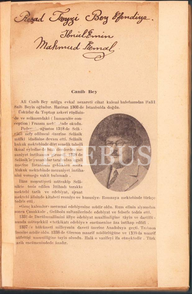 İthaf "Reşad Feyzi Bey Efendi'ye, İbnülemin Mahmud Kemal" şeklindedir. İbnülemin Mahmud Kemal İnal, edebiyat tarihçisi, hal tercümesi yazarı, araştırıcı Trabzonlu Hüsnü Efendi'den tefsir, hadis ve Farsça dersler aldı. Fransızca öğrendi. Kitâbetteki başarısından dolayı Sadâret Mektubî Kalemi'ne terfi etti. Namusu, fazileti, zekâsı, iyi kalpliliği, tok sözlülüğü, mütecessis hali, müşahede kabileyeti, mizah kudreti ve alınganlığıyla garip bir insandı. Eski eşyalara karşı sevgi dolu mizacı, ona önemli evrakların suretlerini çıkarttırmış, not ettirmiş, önemli olayları kaydettirerek yayımlatmış ve bu merakı, ilmi titizliği onu güvenilir kişi haline getirmiştir. Edebiyat, hal tercümesi, kitabiyat, tarih konularında pek çok araştırma yaptı, bazı konuları aydınlığa çıkaran makale ve kitaplar yazdı.
