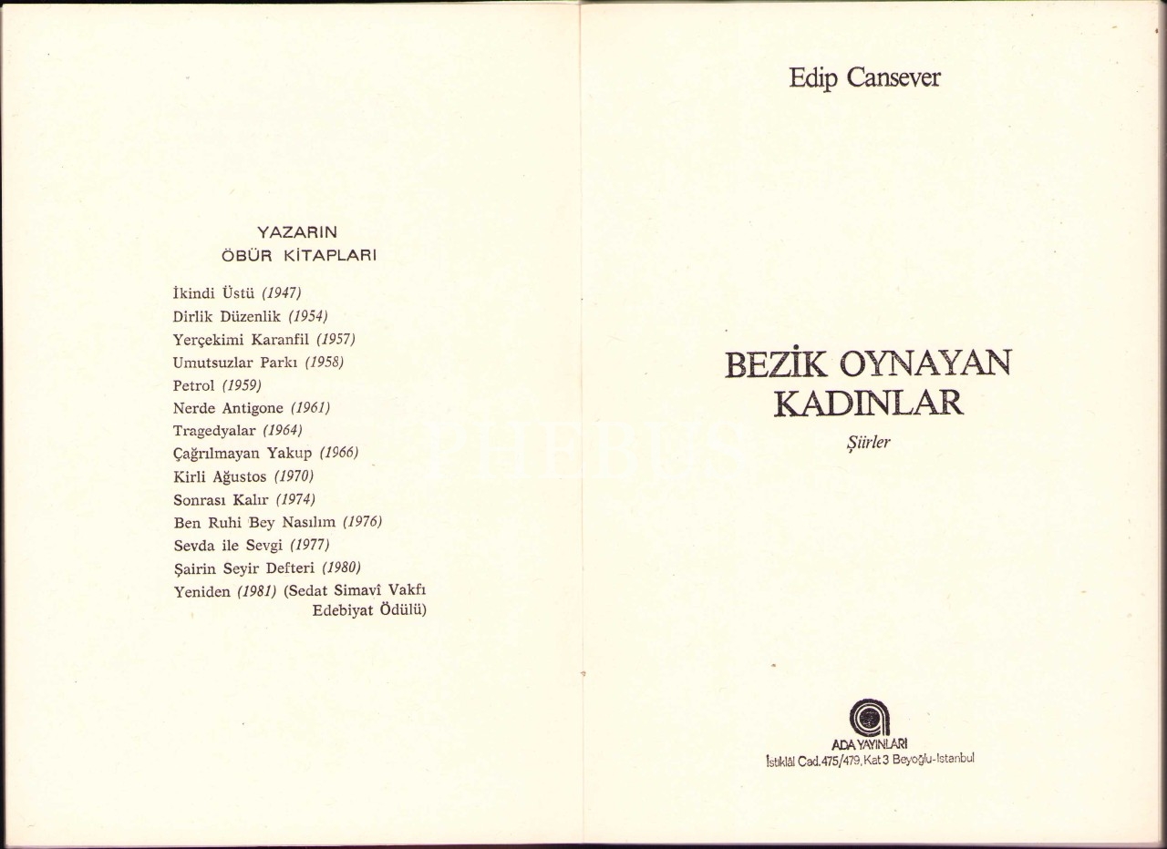 Bezik Oynayan Kadınlar -Şiirler-, Edip Cansever, İlk Baskı, Ada Yayınları, 1982, 109 sayfa