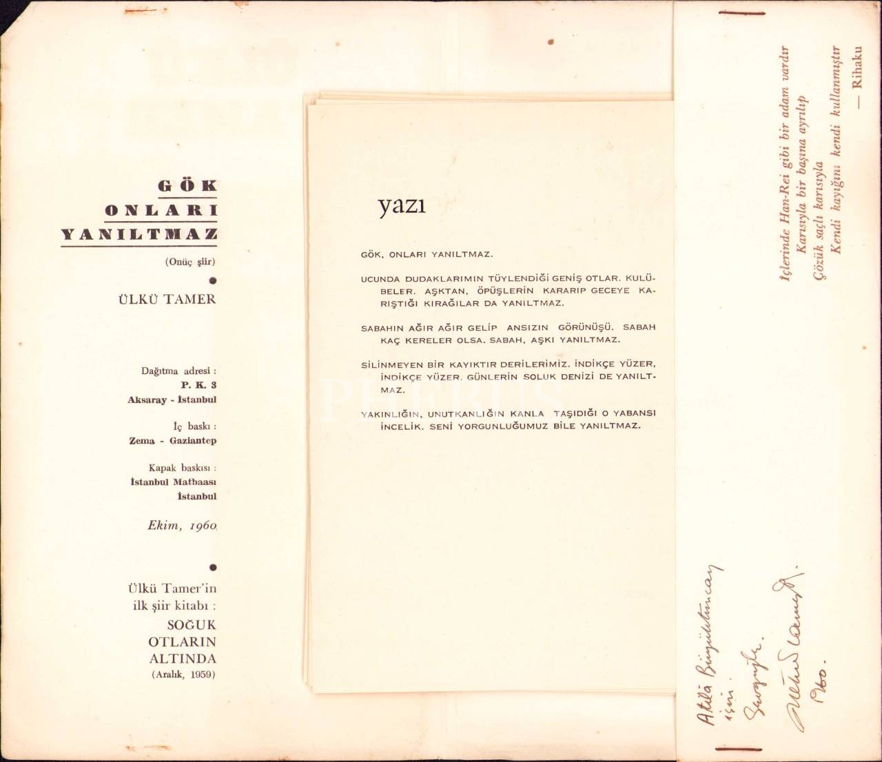 Ülkü Tamer'in Mahkemede 'Kitap' Sayılmayan Eseri: Gök Onları Yanıltmaz, Ülkü Tamer'den İmzalı ve Ithaflı, 13 Şiir, Ekim 1960