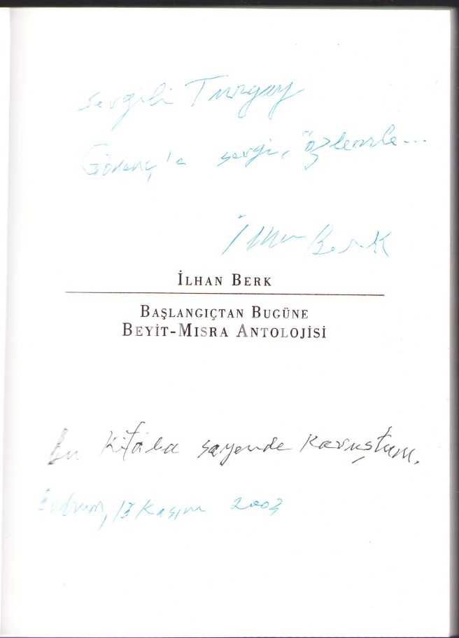 İlhan Berk'ten Şair Ressam Turgay Gönenç'e İthaflı ve İmzalı "Başlangıçtan Bugüne Beyit Mısra Antolojisi", İlk Baskı, Varlık Yayınları, 2003, 144 sayfa