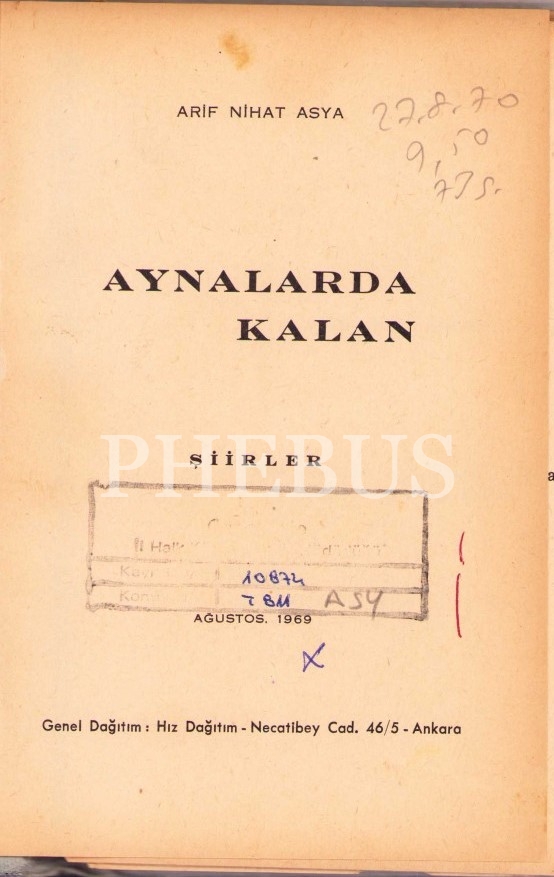 Aynalarda Kalan -Şiirler-, Arif Nihat Asya, Ağustos 1969, Ankara, 73 sayfa
