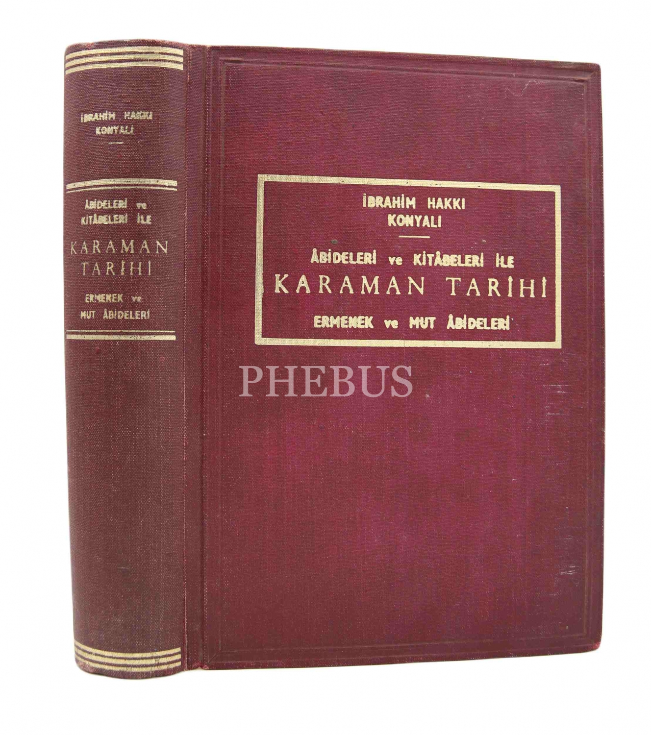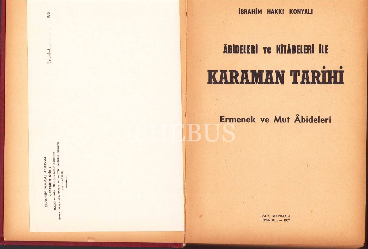 Tarihçi İbrahim Hakkı Konyalı'dan Gazeteci Refi Cevad Ulunay'a İthaflı ve İmzalı "Âbideleri ve Kitâbeleri İle Karaman Tarihi - Ermenek ve Mut Âbideleri", Baha Matbaası, İstanbul 1967, 800 sayfa, 18x24 cm