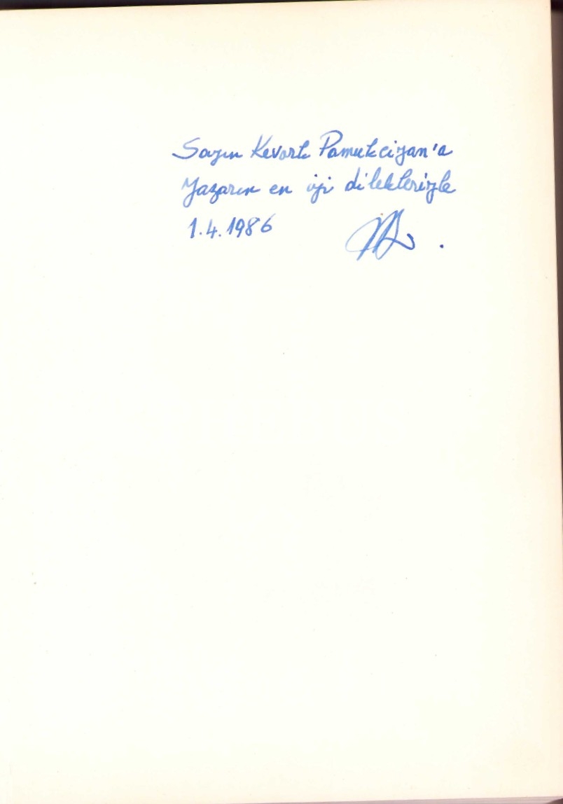 İthaf, "Sayın Kevork Pamukciyan'a yazarın en iyi dilekleriyle 1.4.1986" şeklindedir.