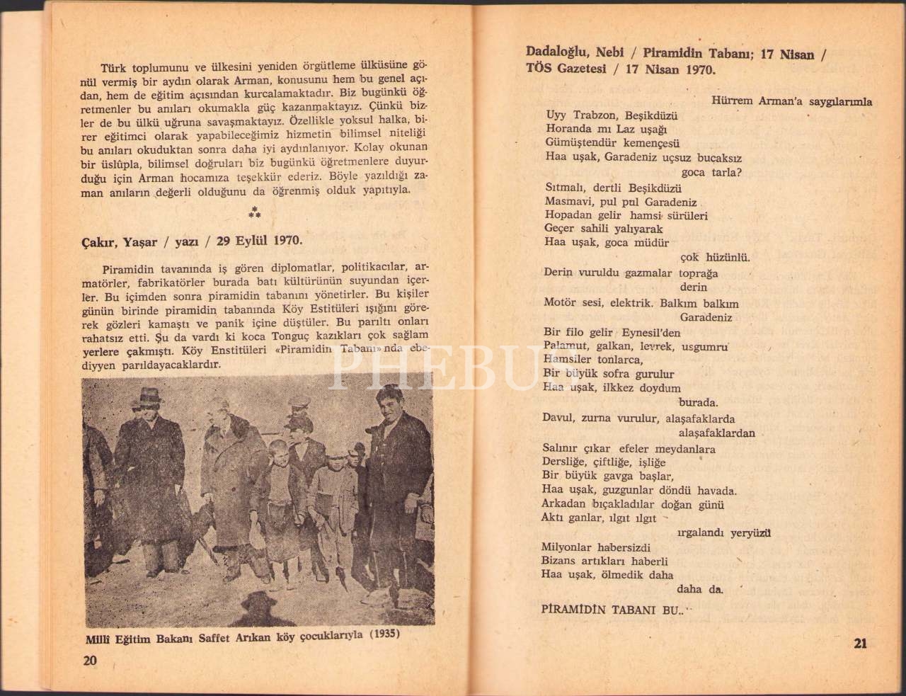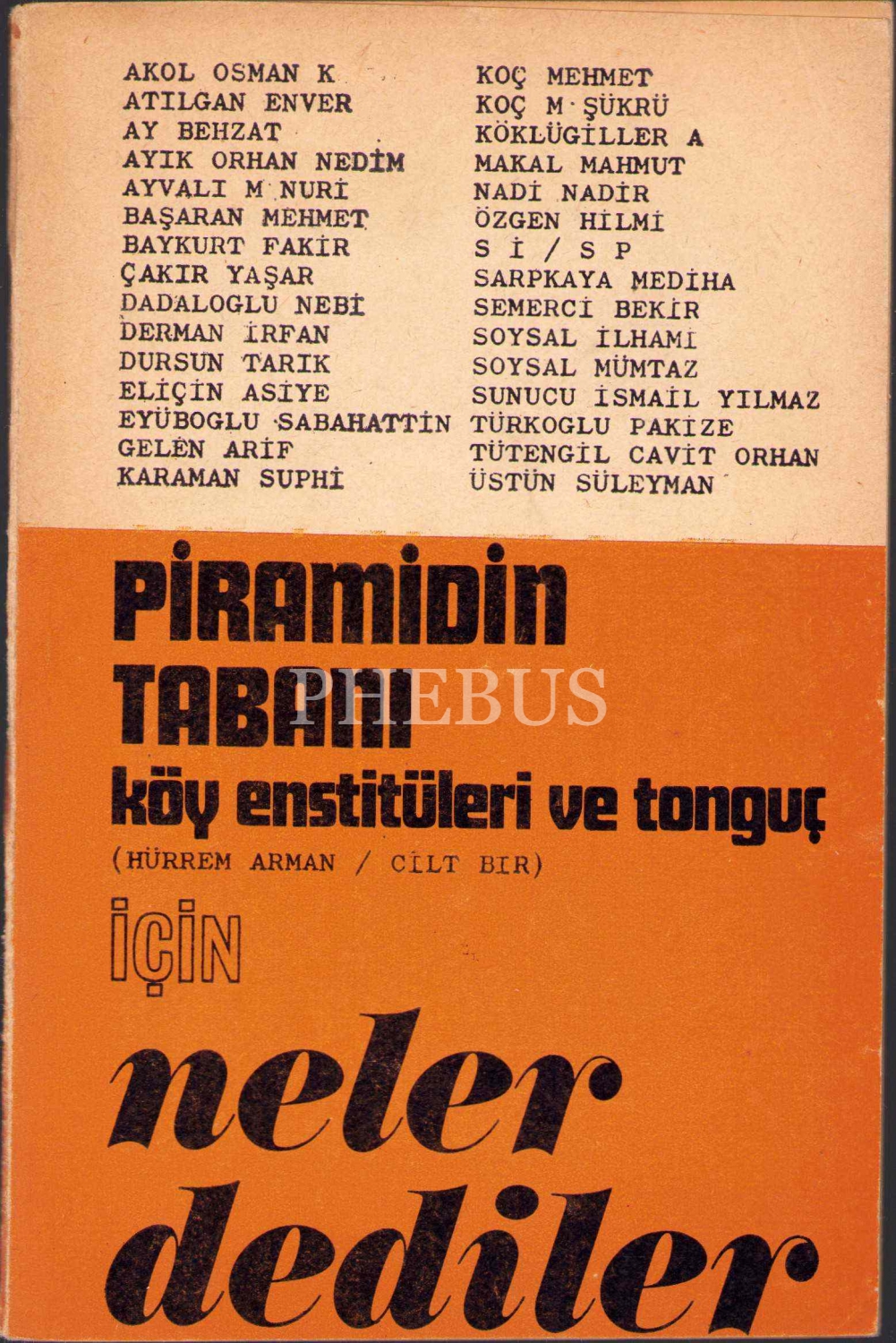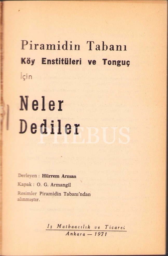 Piramidin Tabanı Köy Enstitüleri ve Tonguç [1. Cilt] (Piramidin Tabanı İçin Neler Dediler adlı kitap ekiyle birlikte), Hürrem Arman'dan İmzalı ve İthaflı, İş Matbaacılık ve Ticaret, Ankara 1969, 483 sayfa, 13x19 cm