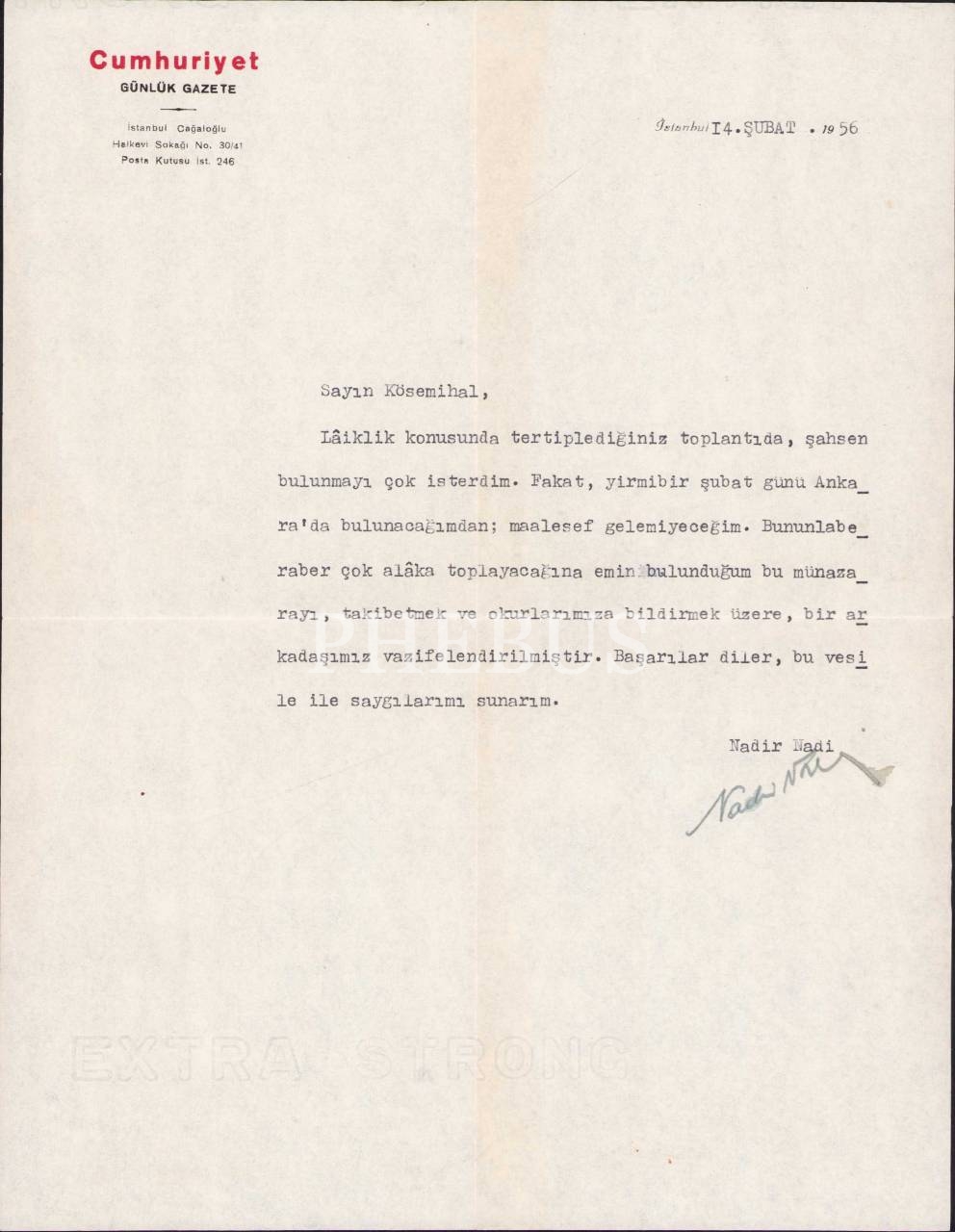 Gazeteci Yazar Nadir Nadi ıslak imzalı Kösemihal'e hitaben yazılan mektup, Cumhuriyet gazetesi antetli, 1956 tarihli, 23x29 cm