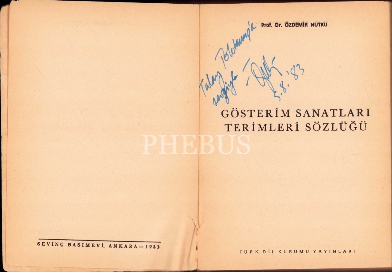 Prof. Dr. Özdemir Nutku'dan İmzalı ve İthaflı "Gösterim Sanatları Terimleri Sözlüğü", Türk Dil Kurumu Yayınları, 1983, 374 sayfa