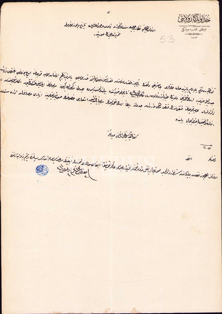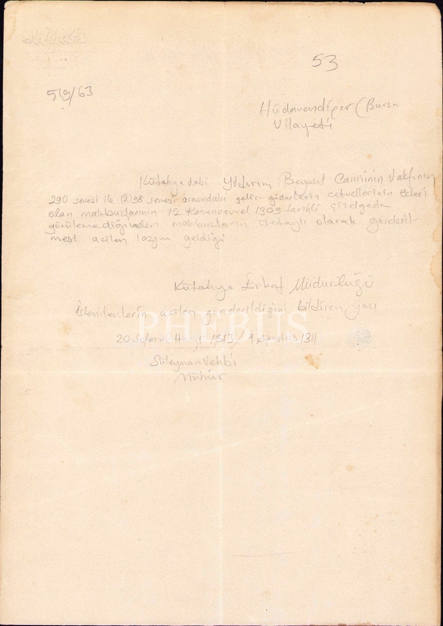 Osmanlıca Hüdavendigâr Vilayeti [Bursa] antetli yazışma evrağı, 1311, 24x33 cm