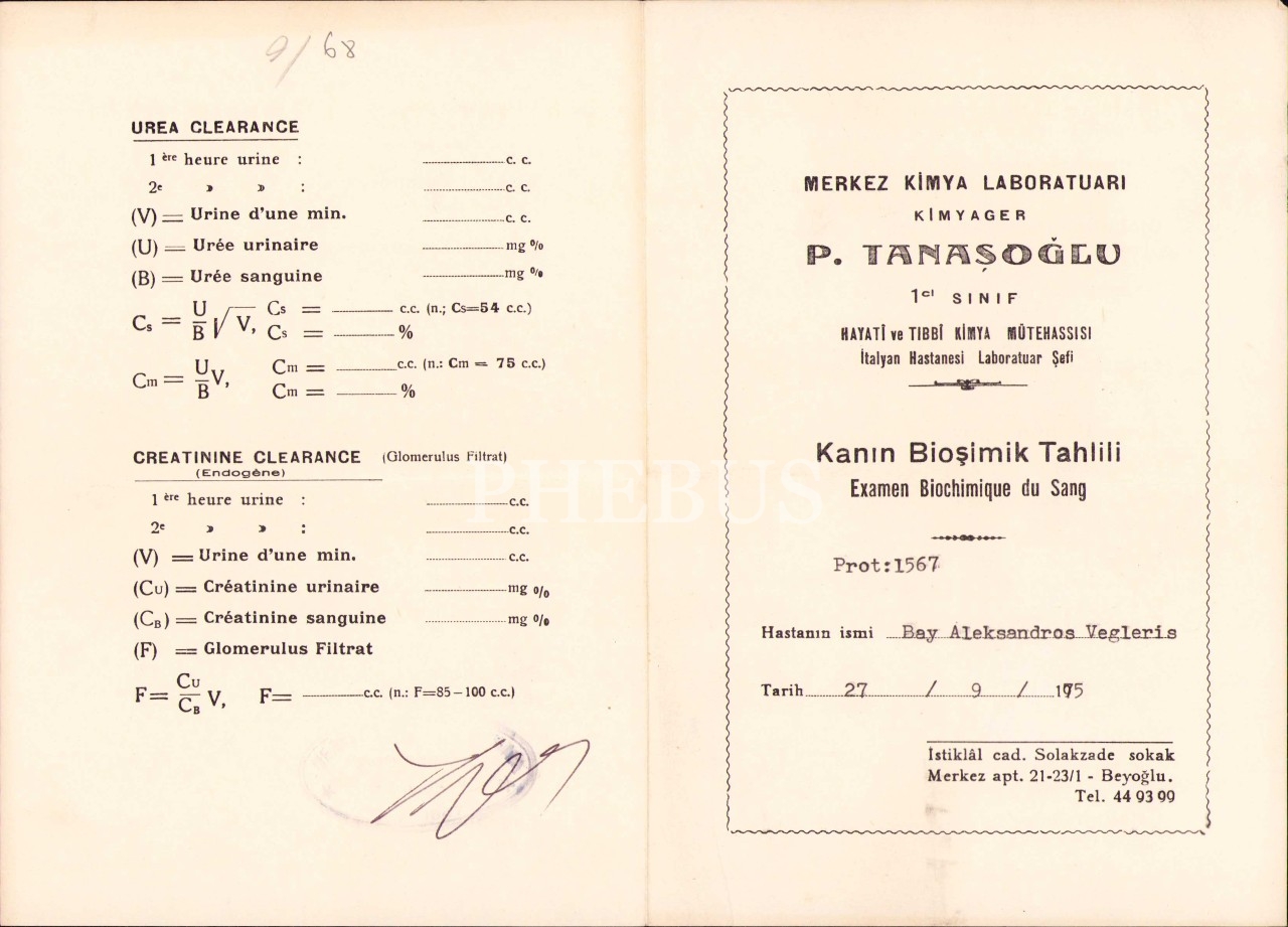 İtalyan Hastanesi Laboratuar Şefi P. Tanaşoğlu onaylı tahlil sonuç kağıdı, İstanbul 1975, 20x28 cm