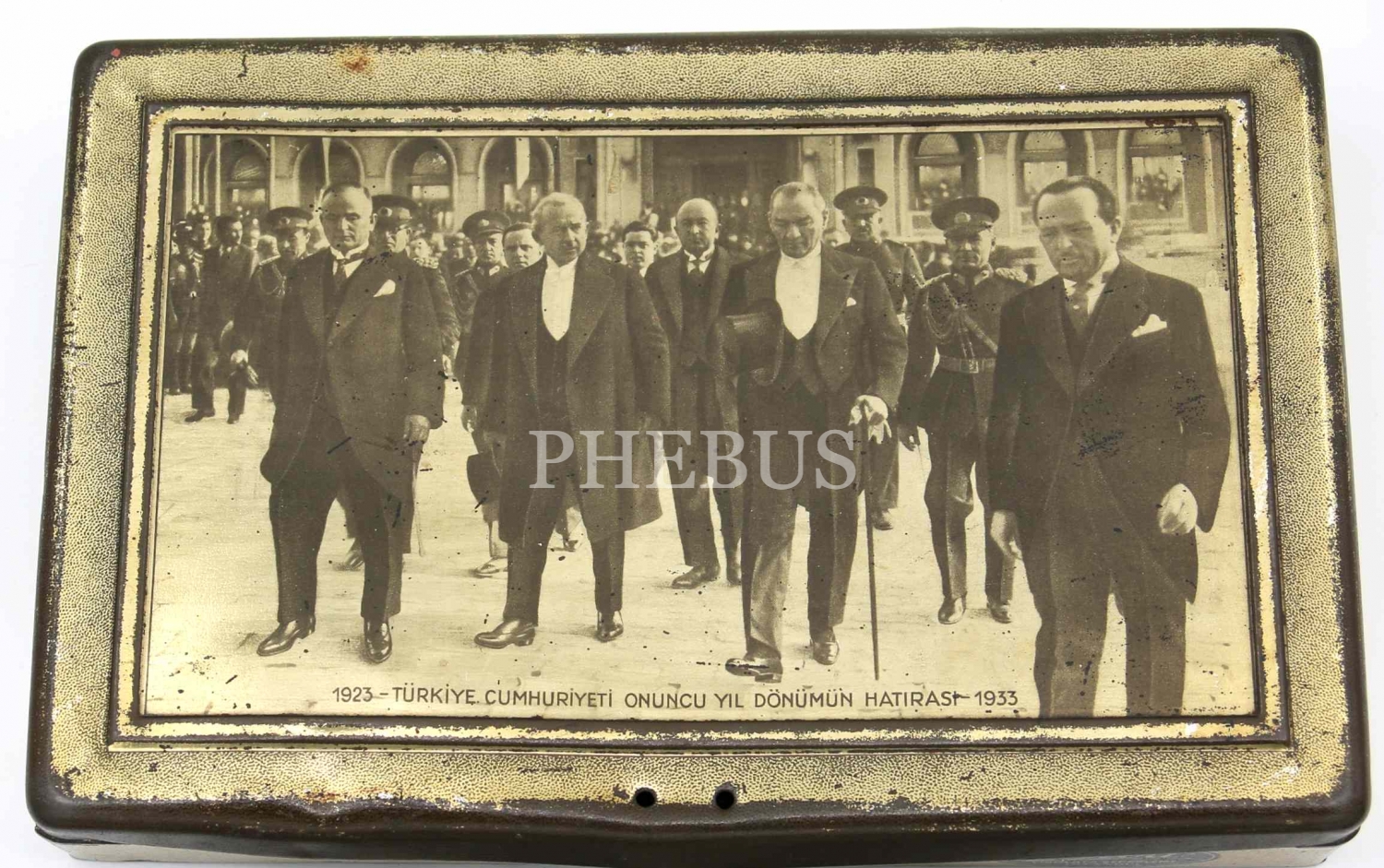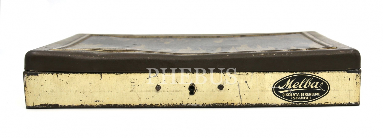 Cumhuriyetin 10. Yıl Dönümü münasebetiyle Atatürk'ü meclisten çıkarken gösteren fotoğraf baskısıyla üretilmiş Melba Çikolata kutusu, 25x17x4 cm