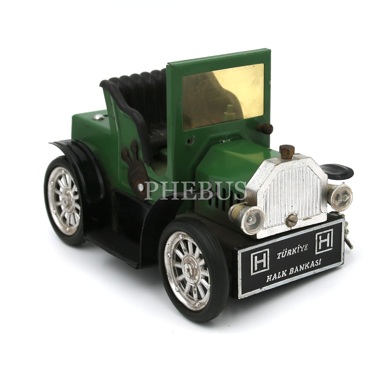 Türkiye Halk Bankası araba formunda metal kumbara,14x9x8 cm, iki tekerleği eksik haliyle