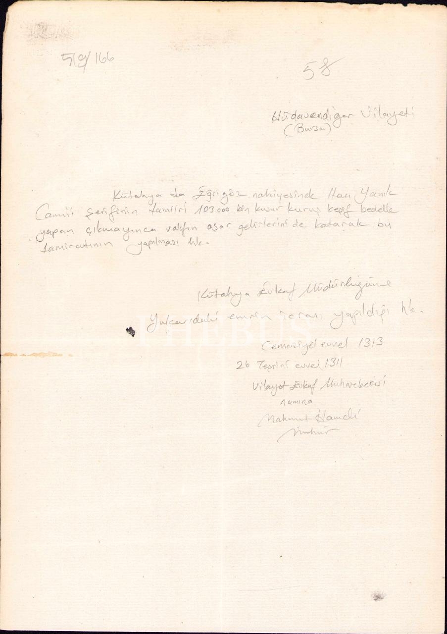 Kütahya Eğrigöz nahiyesinde bir caminin tamiratı hakkında.