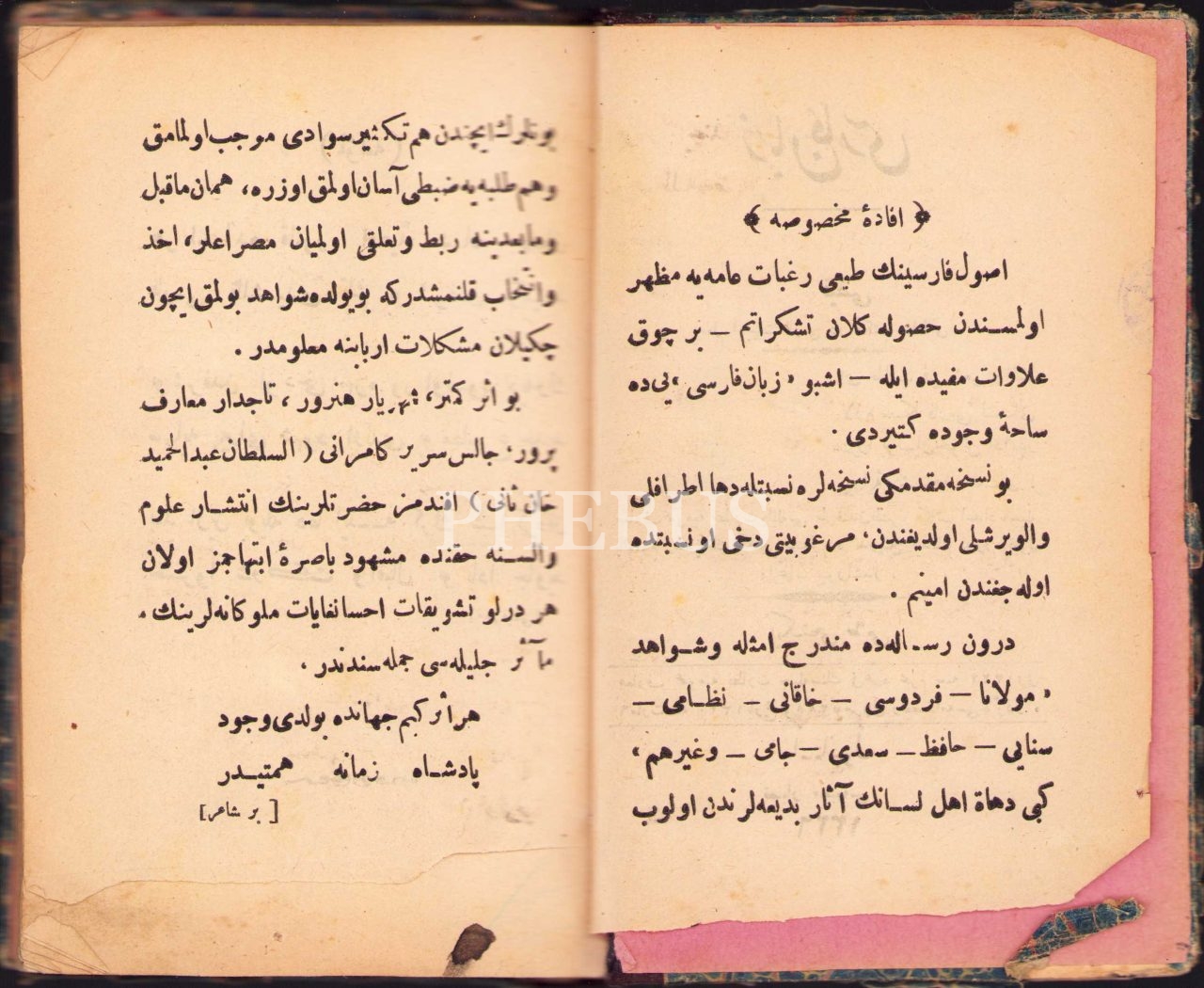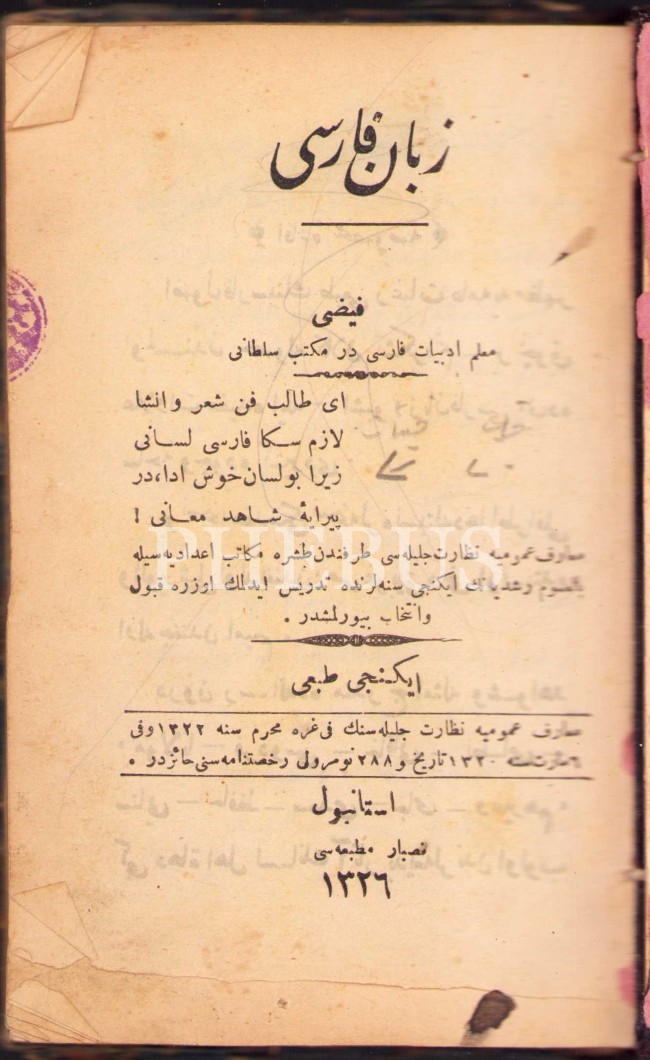Osmanlıca Zebân-ı Fârsî, Feyzi, Kasbar Matbaası, İstanbul 1326, 156 s., 11x18 cm, eksik sayfalar mevcut