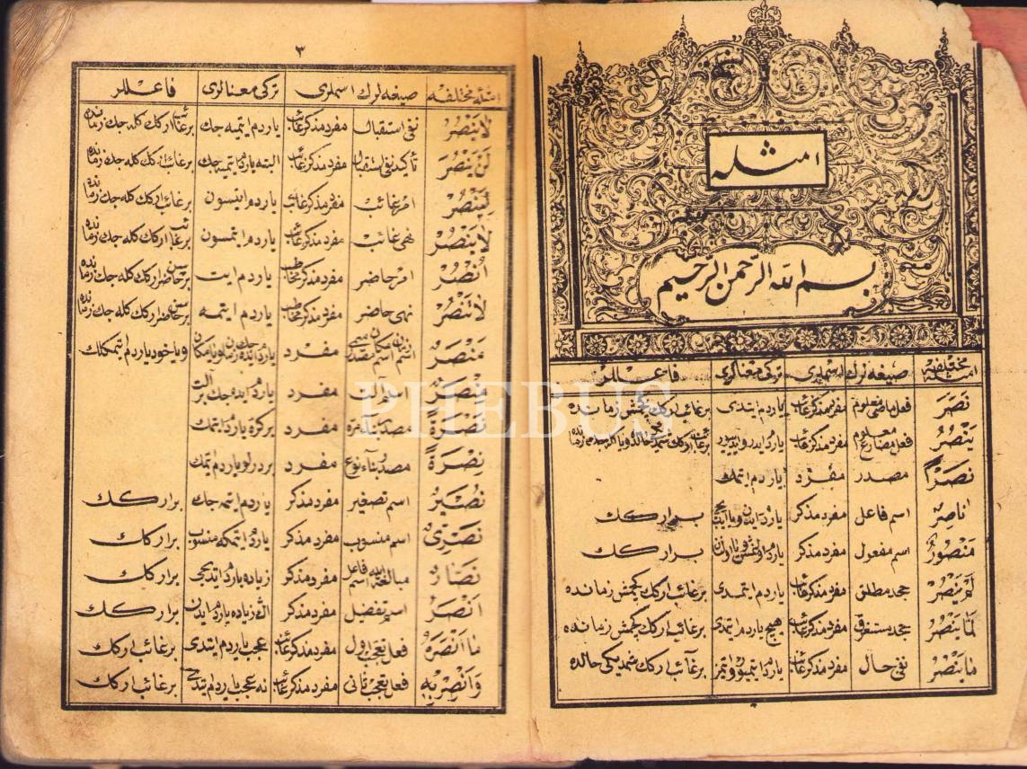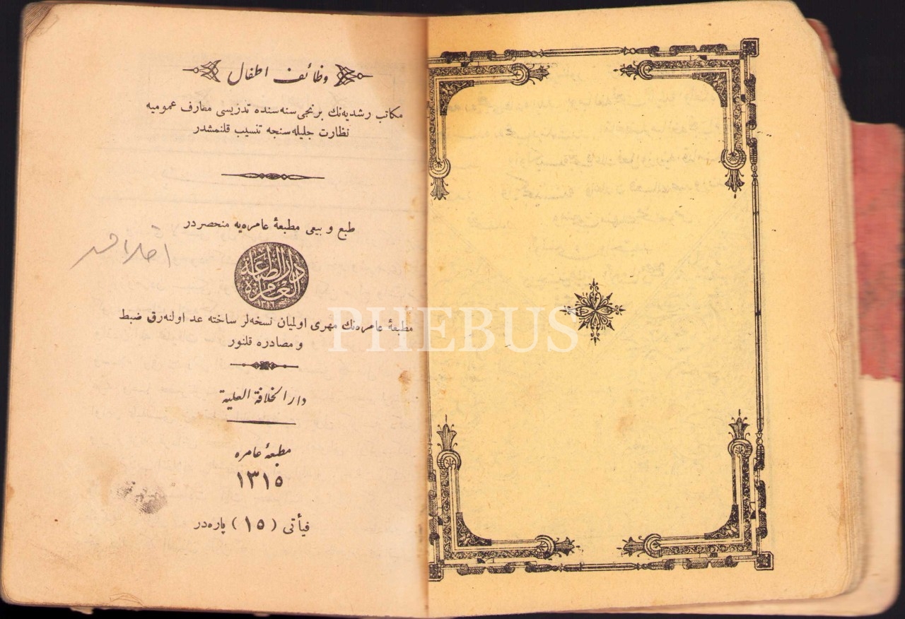 Osmanlıca 2 kitap tek ciltte: Kitâb-ı Emsile, 1312, 31 s.; Vezâif-i Etfâl, Amire Matbaası, 1315, 110 s., 12x16 cm, cildi haliyle