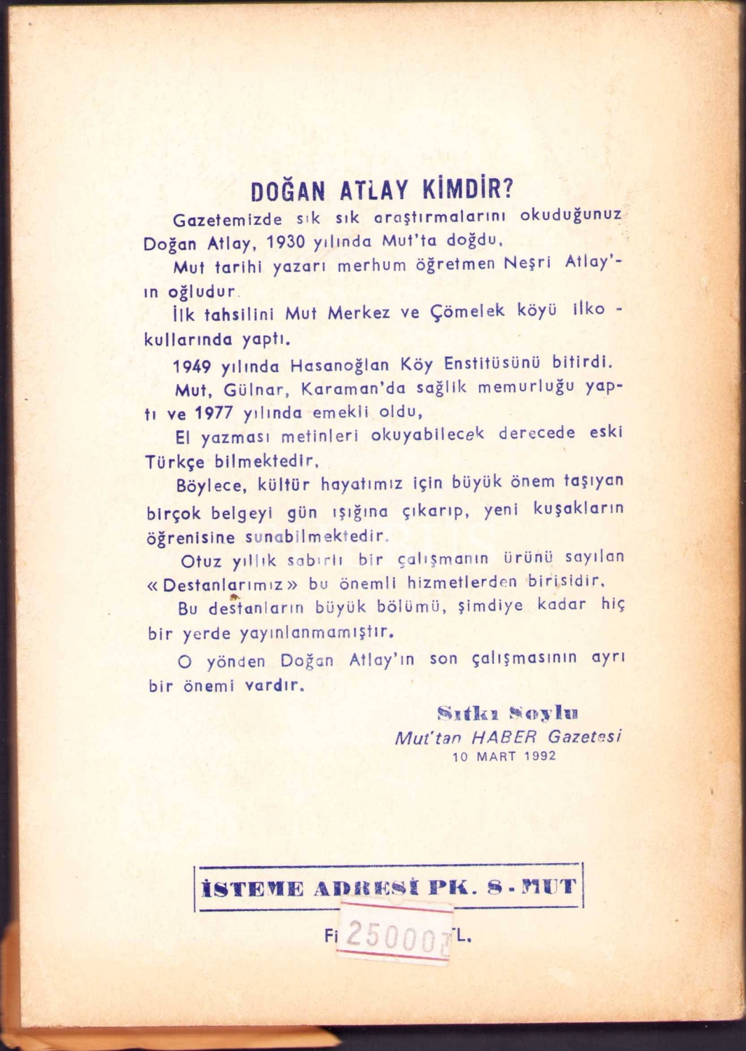 Destanlarımız, Doğan Atlay, Yeni Matbaa, 142 sayfa