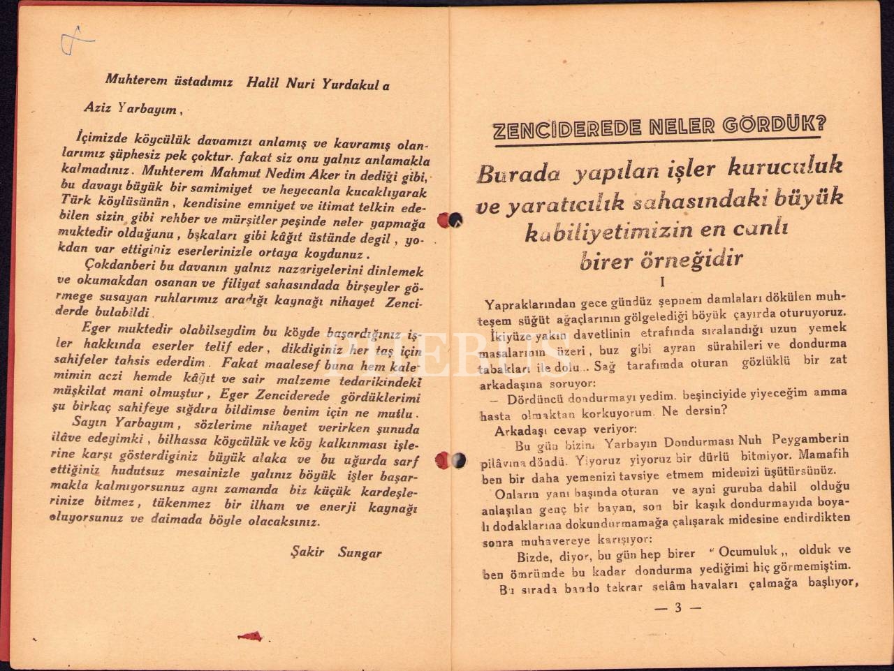 Köy Röportajları: Zenciderede Neler Gördük?, Şakir Sungar, Sümer Matbaası 1948, 37 sayfa, 16x22 cm
