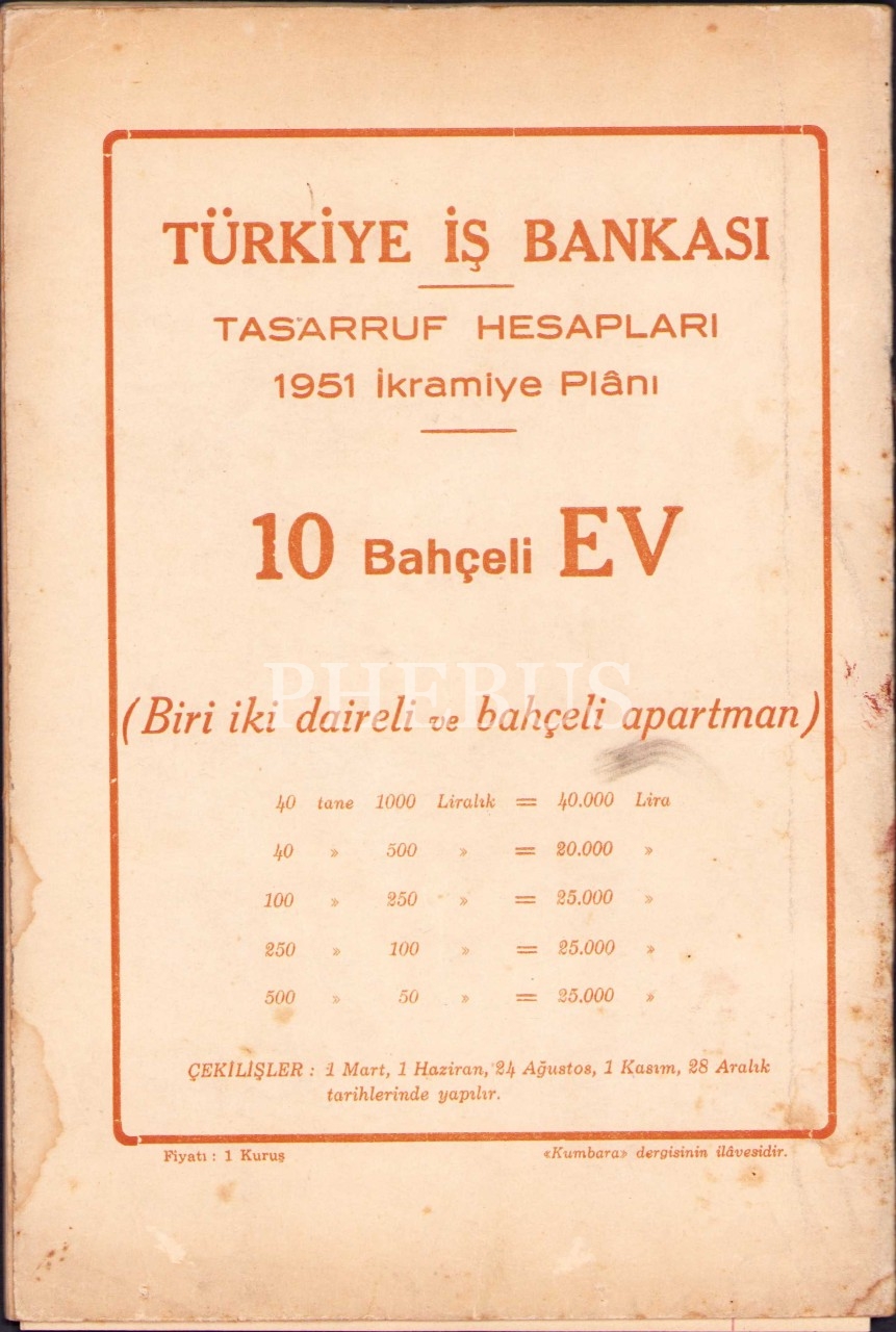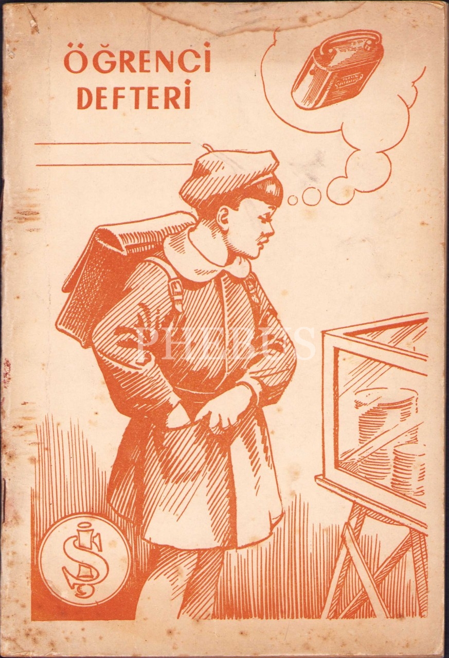 Türkiye İş Bankası kumbara reklamlı öğrenci defteri, boş, arka yüzünde Türkiye İş Bankası Tasarruf Hesapları 1951 İkramiye Planı - 10 Bahçeli Ev yazısı mevcut