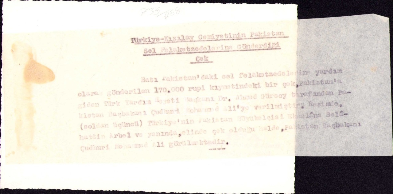 Türkiye Kızılay Cemiyetinin Pakistan Sel Felaketzedelerine Gönderdiği Çek konulu basın fotoğrafı, 18x11 cm