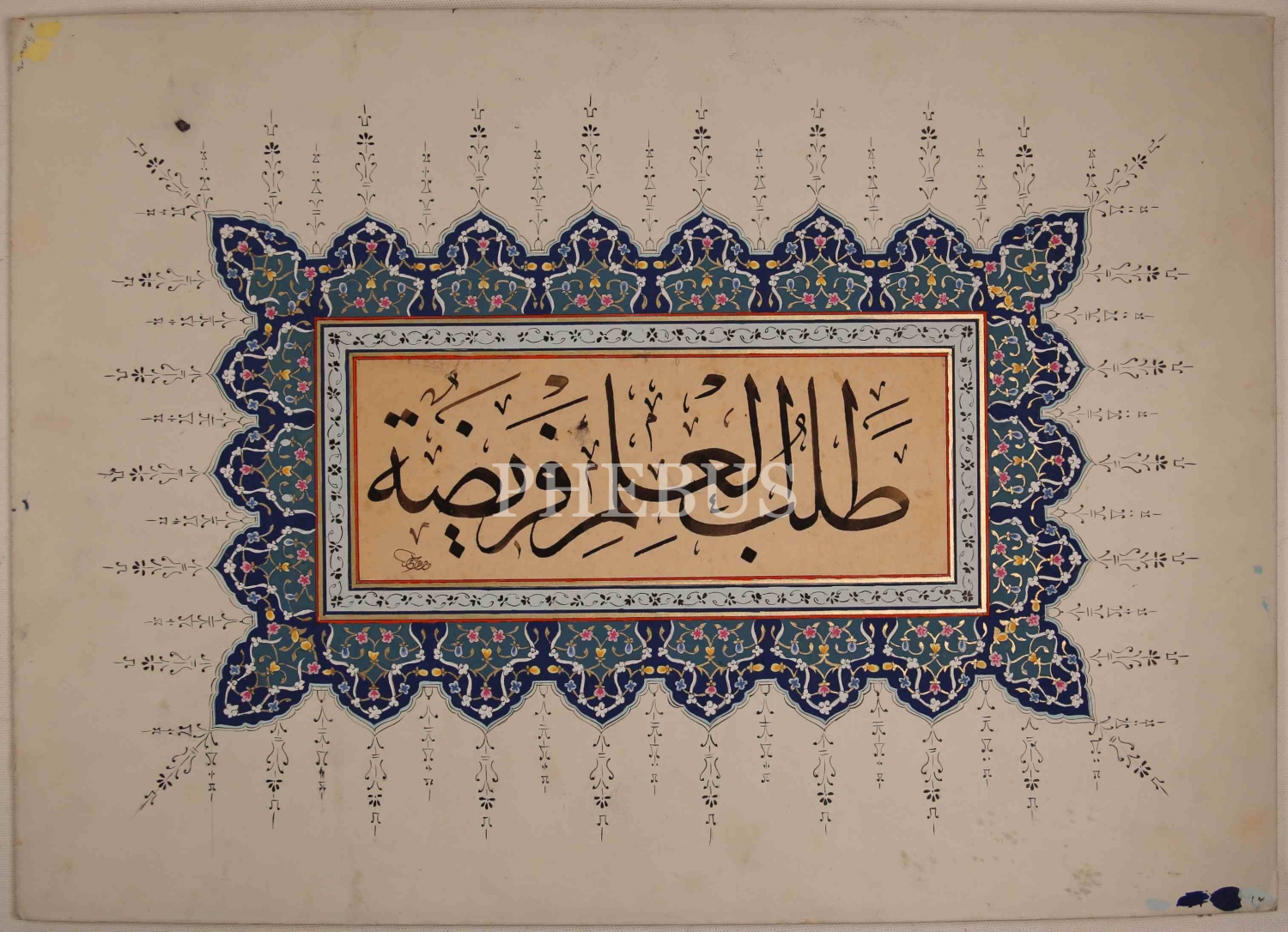 Sülüs Yazı, "Talebu'l-İlmi Farîzatun [İlm talep etmek farzdır]", Mustafa Halim ketebeli, tezhipli ve ebrulu, 10x23 cm
