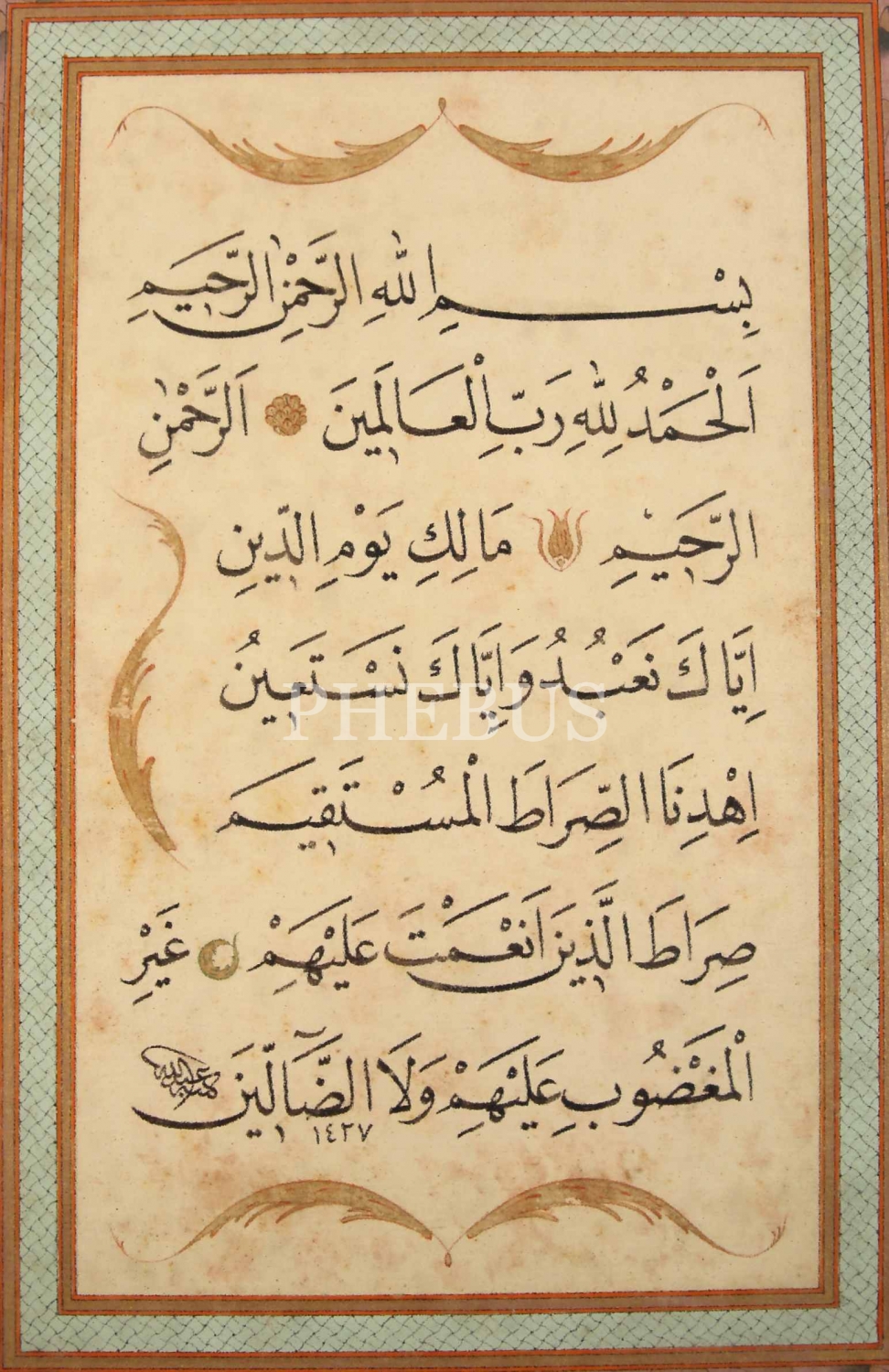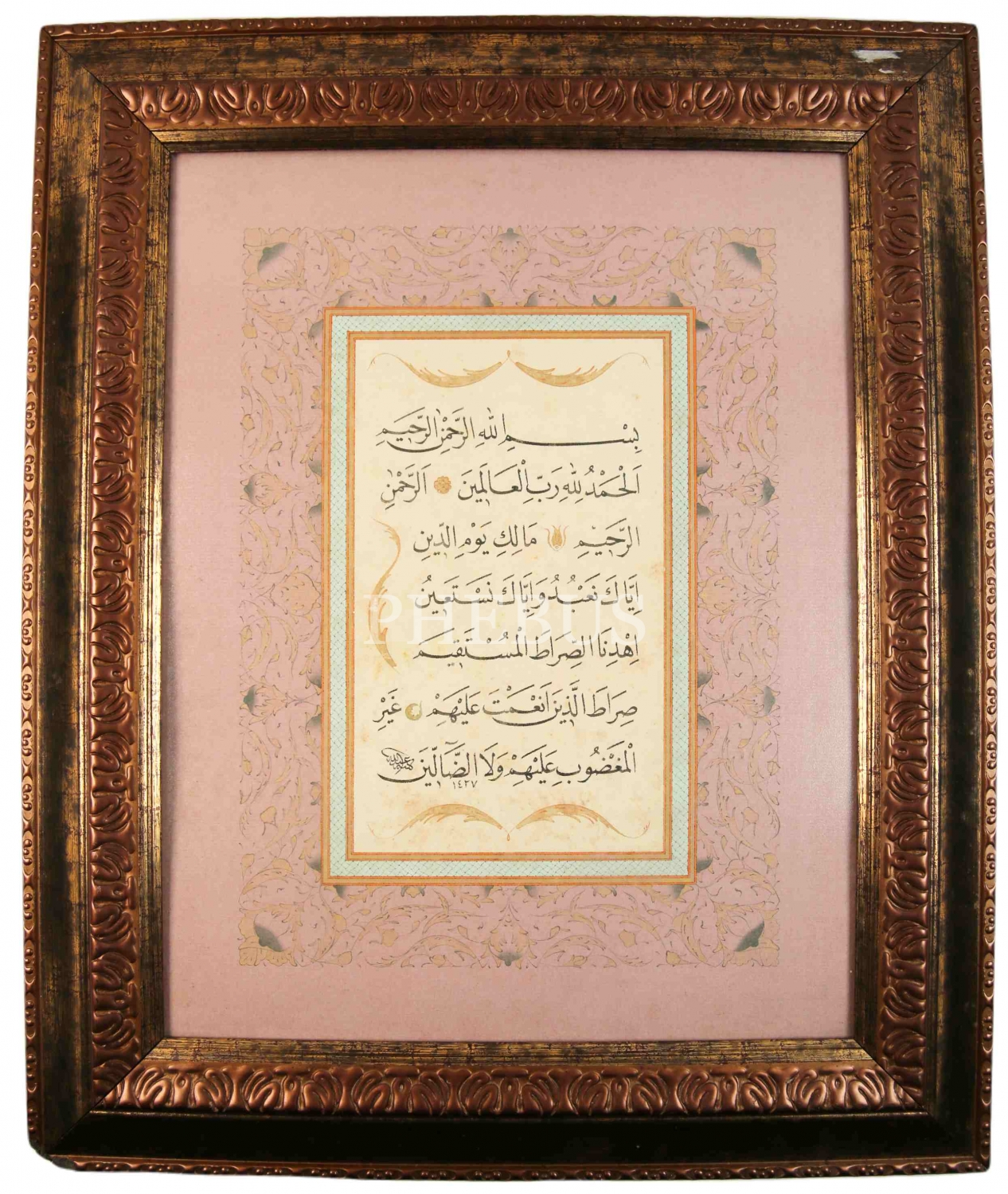 Nesih Fâtiha Suresi, Abdullah ketebeli ve 1427 tarihli, tezhipli, çerçeveli, 16x26 cm