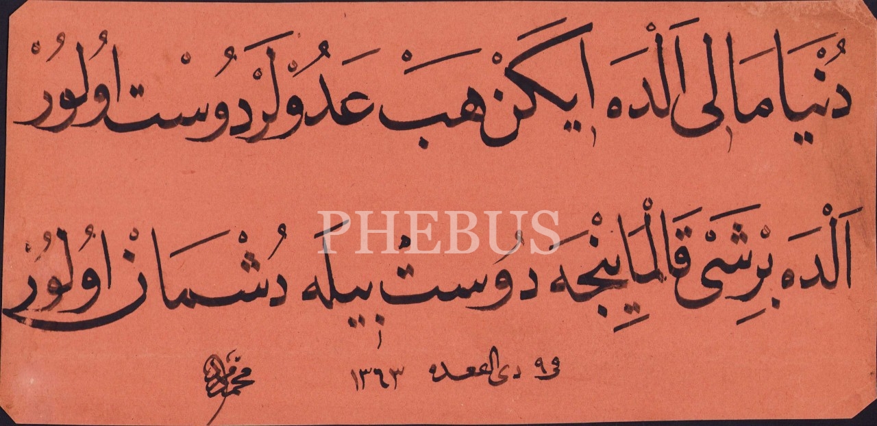 Nesih Yazı, "Dünya malı elde iken heb aduvvlar dost olur, Elde bir şey kalmayınca dost bile düşman olur", Mehmed Murad ketebeli ve 1363 tarihli, 14x30 cm