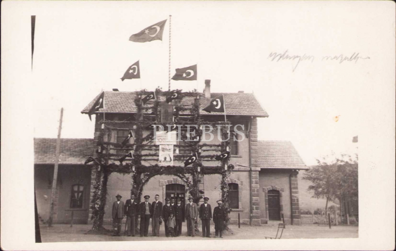 "Cumhuriyetin 10. Yıl Dönümü Hatırası" pankartının asılı olduğu tak önünde hatıra fotoğrafı
