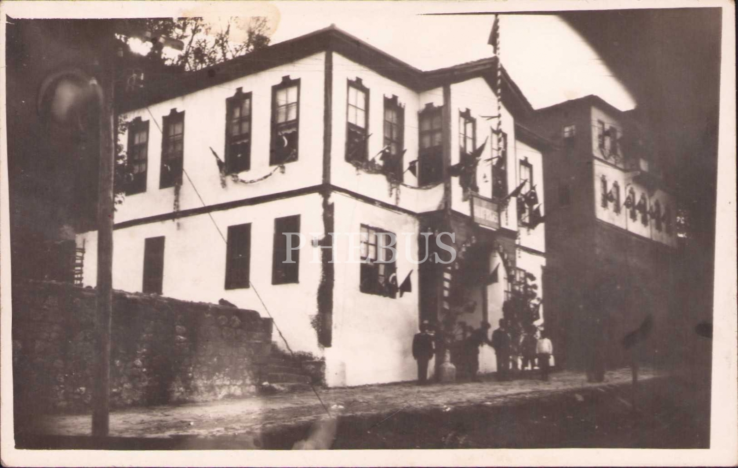Halk Fırkası tabelası asılı bina önünde hatıra fotoğrafı