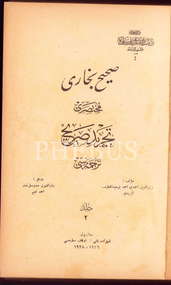 Diyanet İşleri Reisliği Neşriyatından Osmanlıca Sahîh-i Buhârî Muhtasarı Tecrîd-i Sarîh Tercümesi [2. cilt], Zeyneddin Ahmed b. Ahmed b. Abdullatif ez-Zebidî, Çev. Ahmed Naim, Evkâf Matbaası, İstanbul 1928, 16x24 cm
