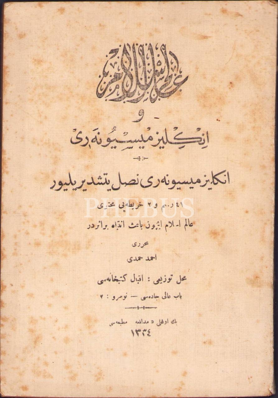 Osmanlıca Âlem-i İslâm ve İngiliz Misyoneri- İngiliz Misyoneri Nasıl Yetişdiriliyor, Ahmed Hamdi, Müdafaa Matbaası 1334, 112 s., 15x22 cm