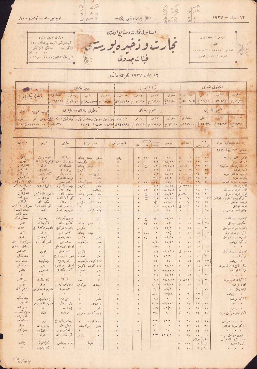 Osmanlı İstanbul Ticaret ve Sanayi Odası Ticaret ve Zahire Borsası Fiyat Cetveli, 12 eylül 1927 tarihe ait, Osmanlıca, 4 sayfa, 28x42cm