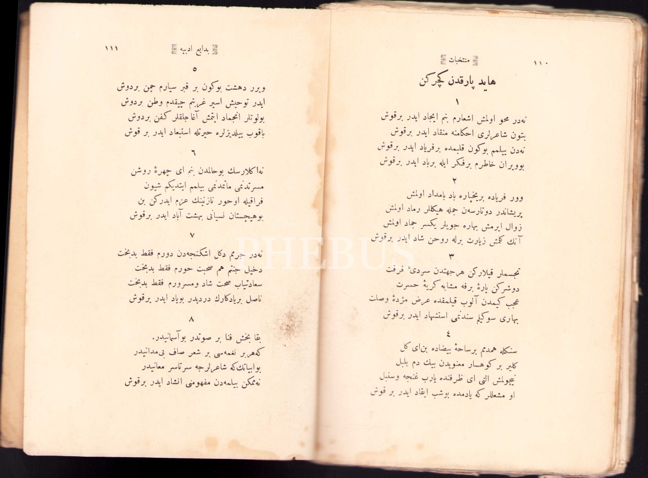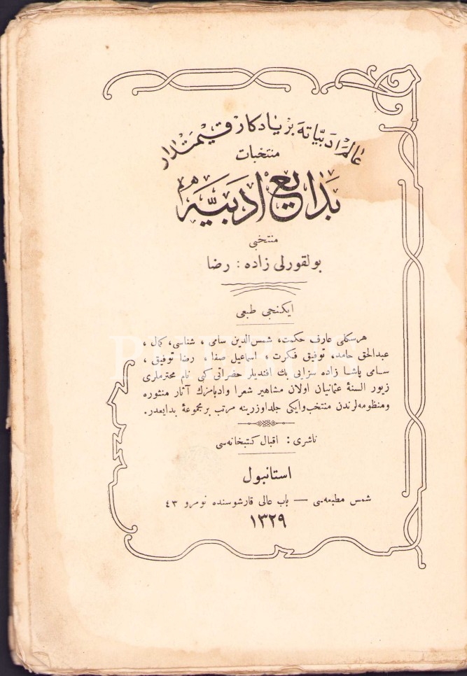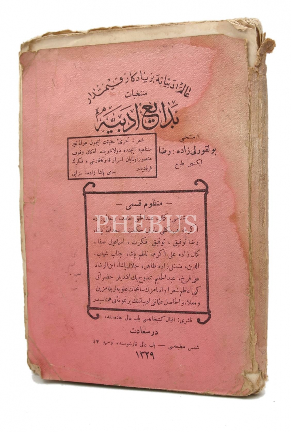 Osmanlıca Müntehabât-ı Bedâyi-i Edebiyye [2. baskı], Derl. Bulgurluzâde Rıza, Şems Matbaası, İstanbul 1329, 112 s., 15x21 cm, cildi haliyle