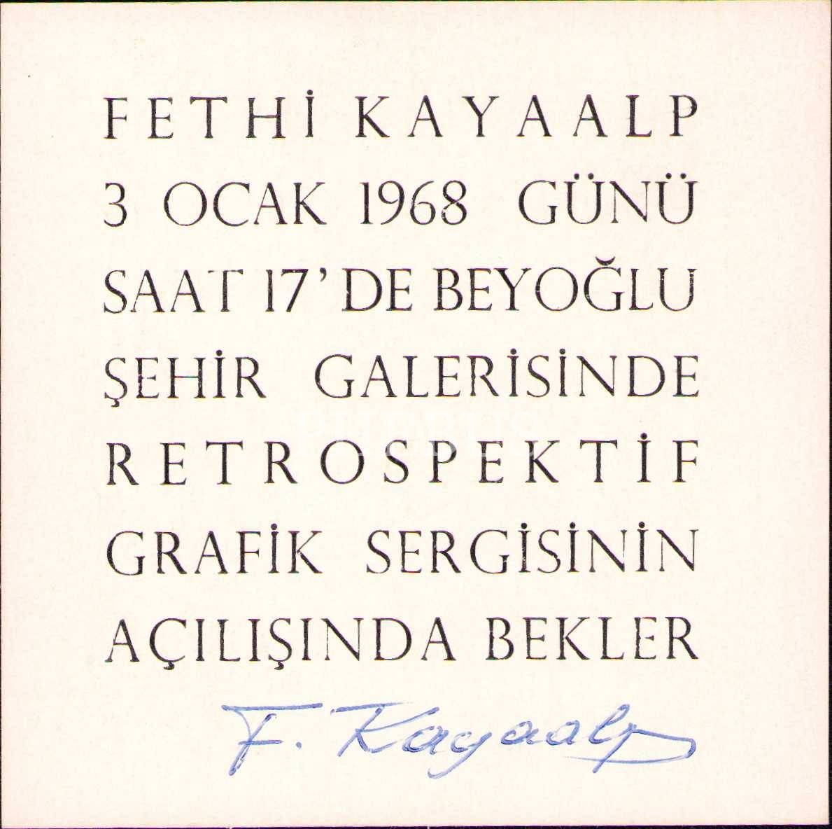 Ressam ve Restoratör Fethi Kayaalp'ten İmzalı Beyoğlu Şehir Galerisi'ndeki Retrospektif Grafik Sergisi Davetiyesi, 10x10 cm