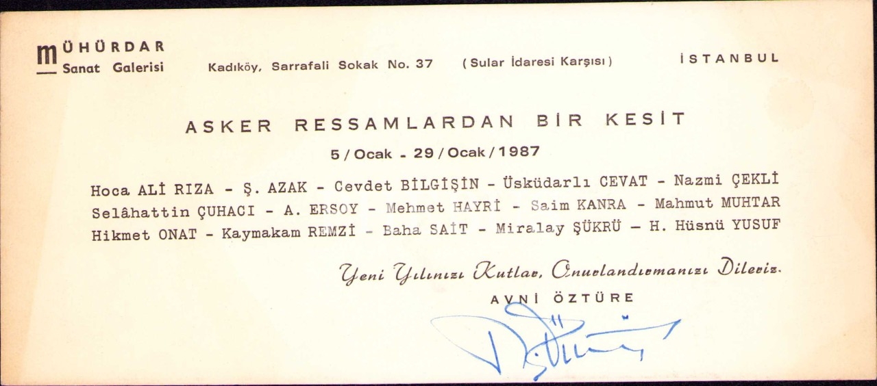 Yazar ve Gazeteci Avni Öztüre'den Islak İmzalı ''Asker Ressamlardan Bir Kesit'' - 5 Ocak-29 Ocak 1987, Mühürdar Sanat Galerisi - Kadıköy, 24x11 cm