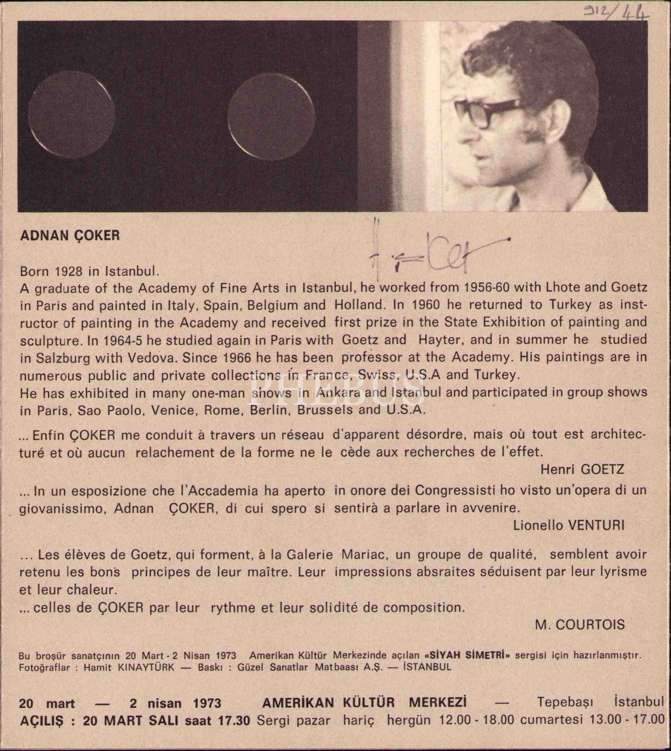 Ressam Adnan Çoker'den Islak İmzalı ''Siyah Simetri'' Sergi Broşürü, 20 Mart-2 Nisan 1973 - Amerikan Kültür Merkezi, 18x20 cm