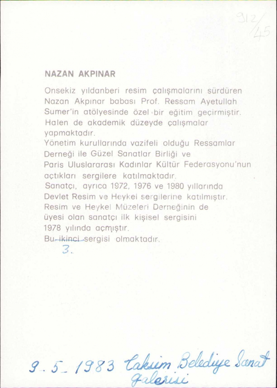 Ressam Nazan Akpınar'dan Islak İmzalı Sergi Davetiyesi, 9.5.1983 Taksim Belediye Sanat Galerisi, 11x15 cm