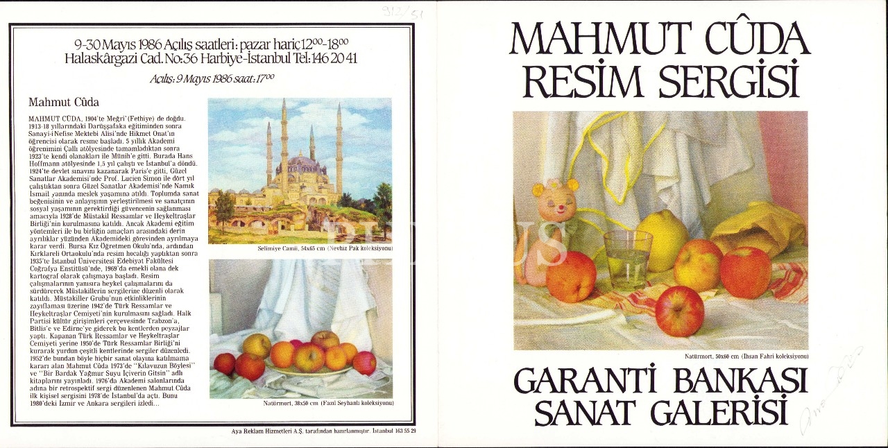 Ressam Mahmut Cûda'dan İmzalı Resim Sergisi Broşürü, Garanti Bankası Sanat Galerisi, 9-30 Mayıs 1986, 22x22 cm