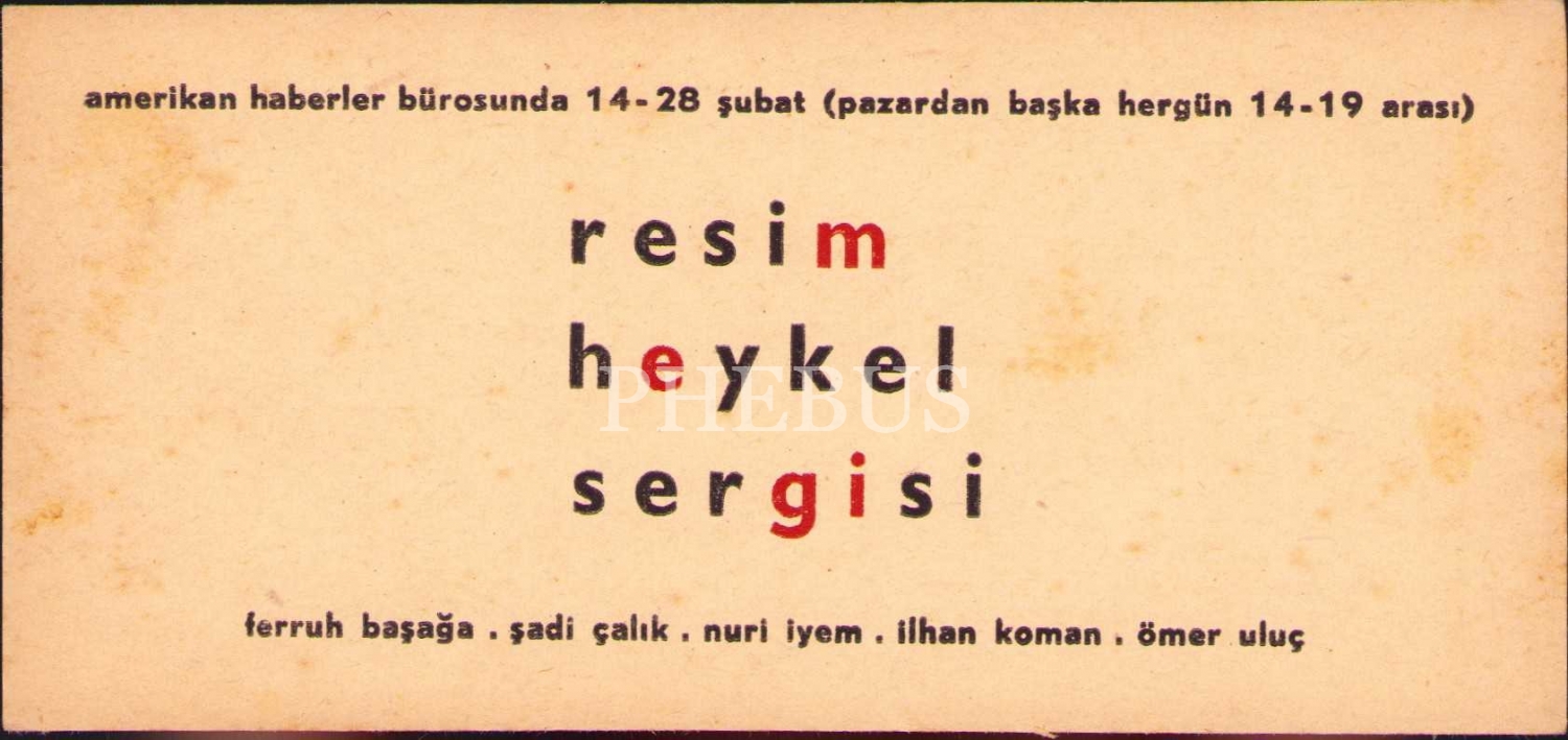 Ressam Ferruh Başağa'dan Islak İmzalı Resim - Heykel Sergisi Davetiyesi, Amerikan Haberler Bürosu, 14-28 Şubat (1960), 15x8 cm