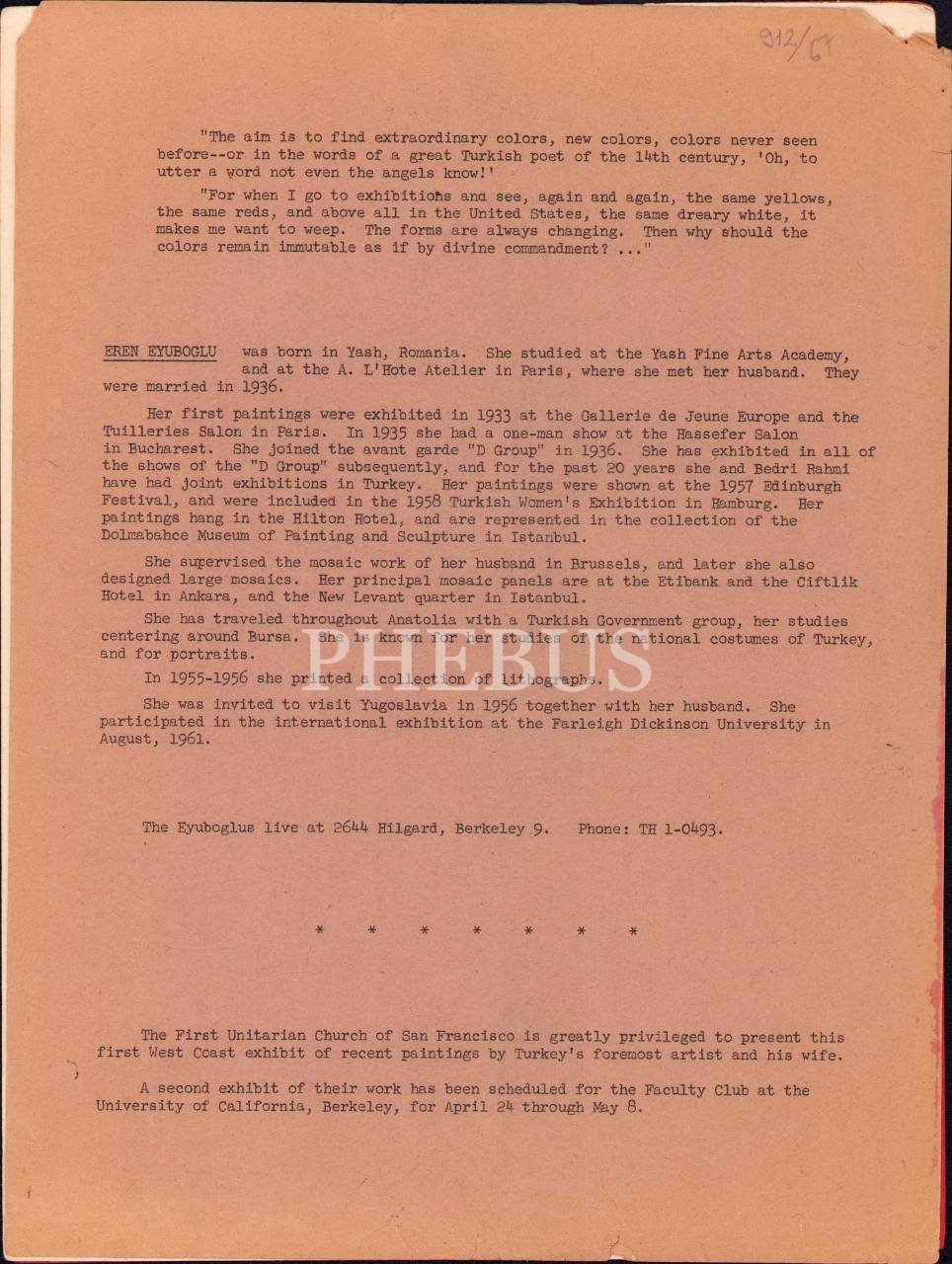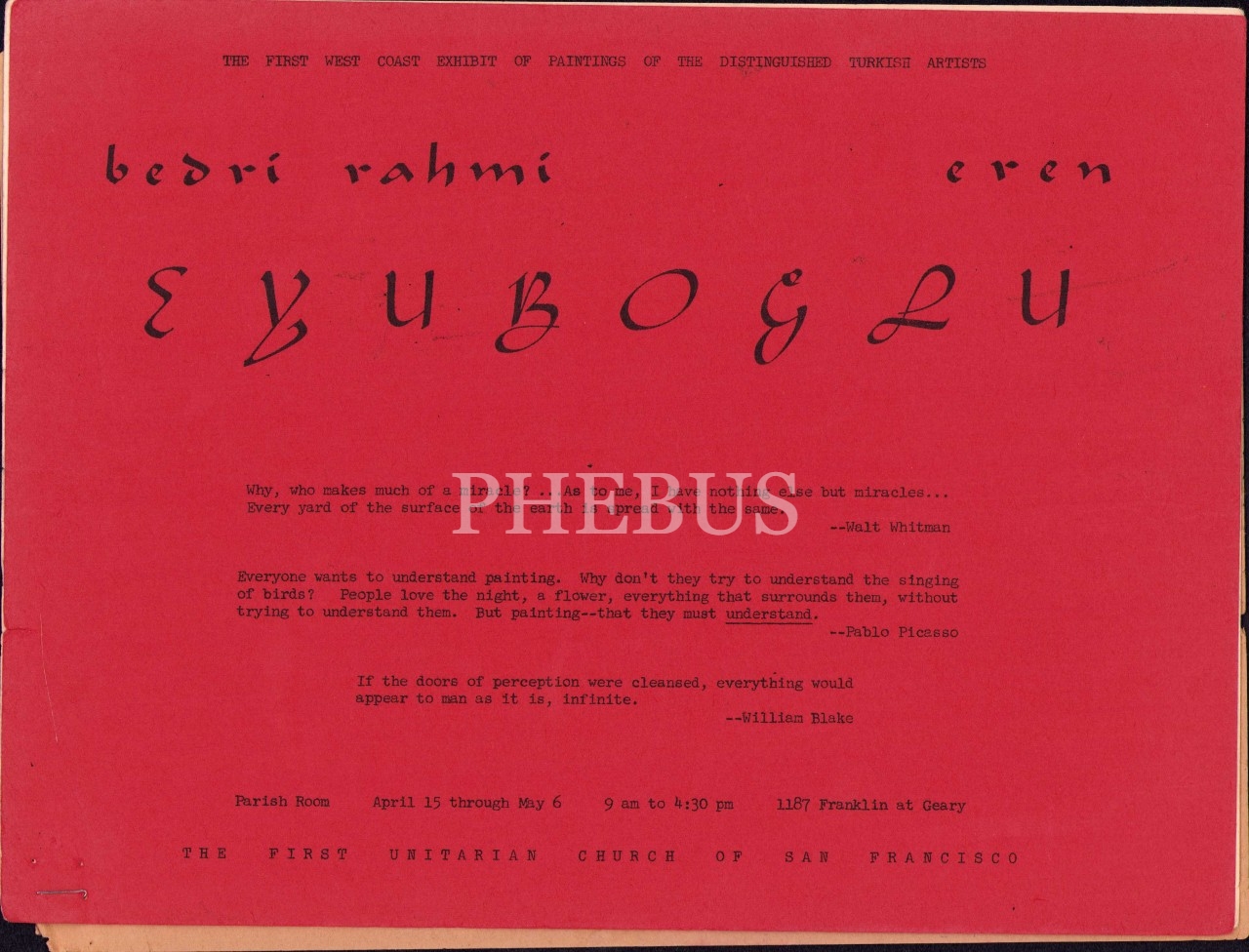 Bedri Rahmi ve Eren Eyüboğlu'nun San Francisco'da Düzenlenen Sergilerinin Kataloğu ve Tanıtım Metni, 4 sayfa, 24x32 cm