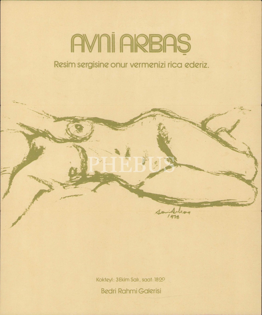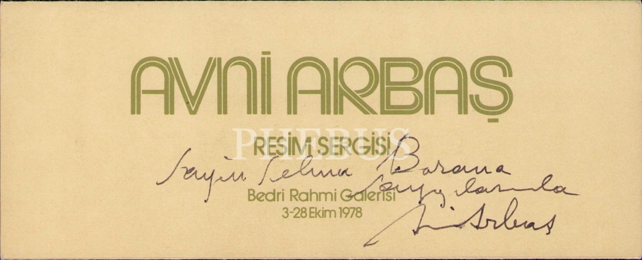 Avni Arbaş Resim Sergisi Davetiyesi, Ressam Avni Arbaş'tan İthaflı ve İmzalı, Bedri Rahmi Galerisi, 3-28 Ekim 1978, 10x23 cm