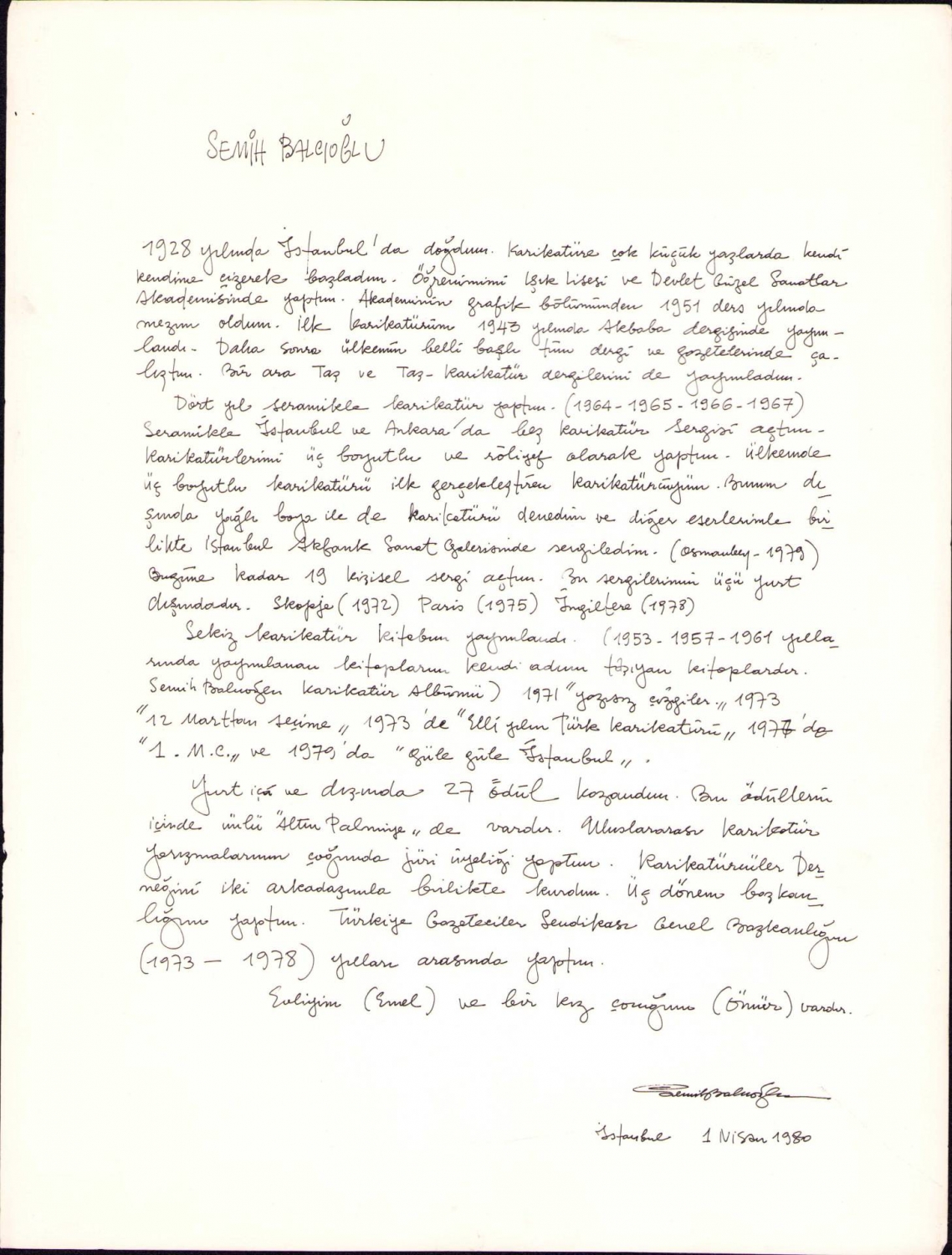 Karikatürist Semih Balcıoğlu tarafından 1 Nisan 1980 tarihinde kaleme alınmış, Balcıoğlu'nun kısaca hayatını ve çalışmalarını aktardığı mektup, 26x34 cm